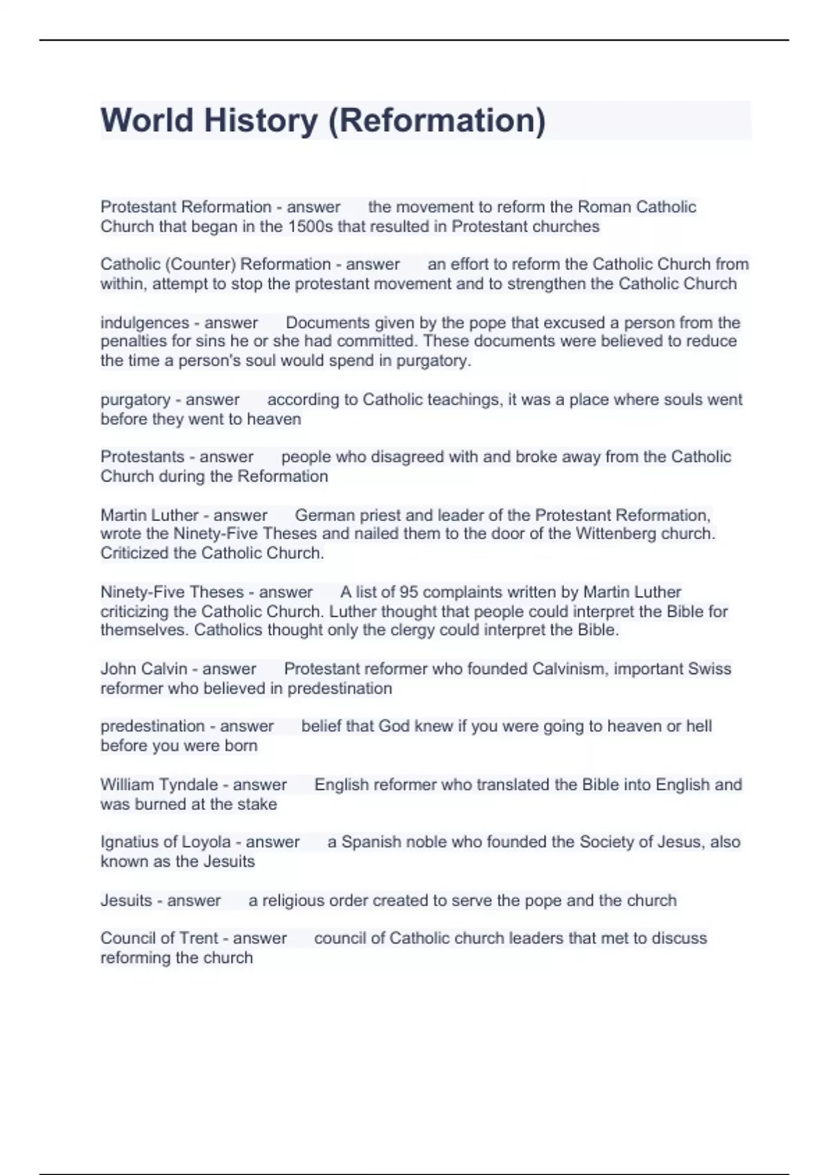 Protestant Reformation Questions and Answers fully solved 2023
