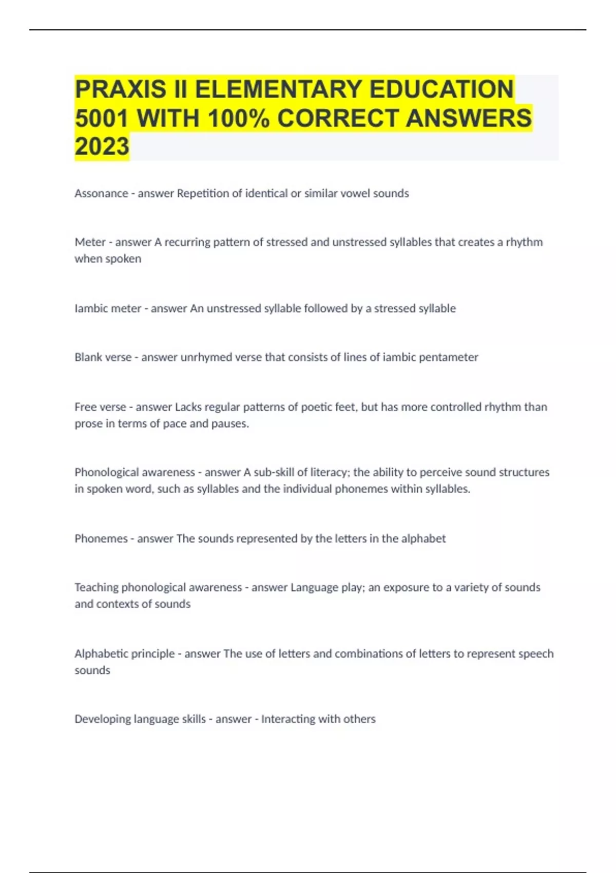 PRAXIS II ELEMENTARY EDUCATION 5001 WITH 100% CORRECT ANSWERS 2023
