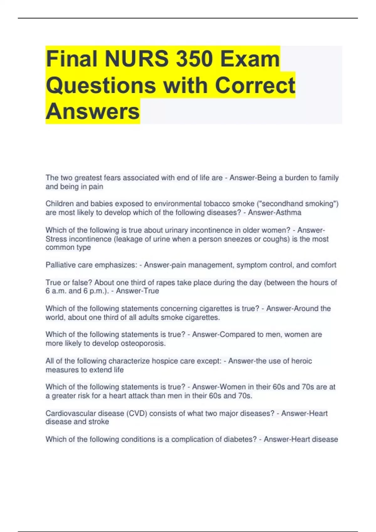 SDSU Nurs350 Exam Questions with Correct Answers 2 Exam (elaborations) Nurs350 Exam 4 Questions with Correct Answers 3 Exam (elaborations) NURS 350 Final Test Questions and Answers All Correct 4 Exam (elaborations) NUR 350 Chap 20 Exam Questions and Answers 5 Exam (elaborations) NURS 350 Exam 1 Questions with Correct Answers 6 Exam (elaboratio