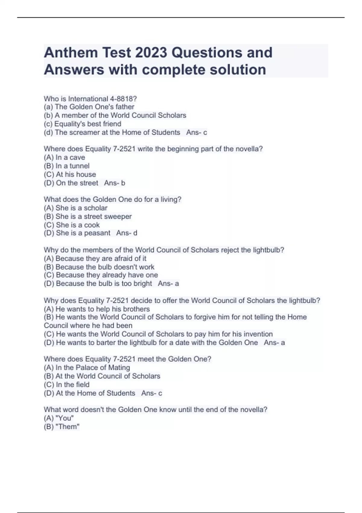 Anthem Study Guide 2023 Actual Questions and Answers with complete solution Anthem by Ayn Rand Review exam 2023 questions and answers complete Anthem review exam questions and answers with complete solution Anthem review exam questions and answers with complete solution