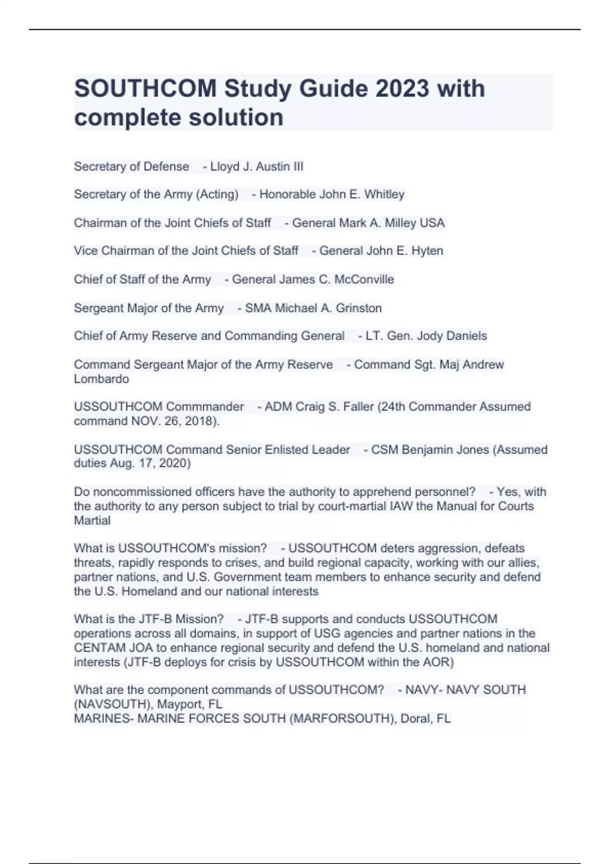 SOUTHCOM EPOQ Study Guide 2023 with complete solution SOUTHCOM Human Rights Awareness Actual Questions and Answers Solved Correctly and Verified SOUTHCOM Human Rights Awareness PRETEST 2023 with complete solution OUTHCOM Human Rights 2023 Questions and Answers with complete information and answers
