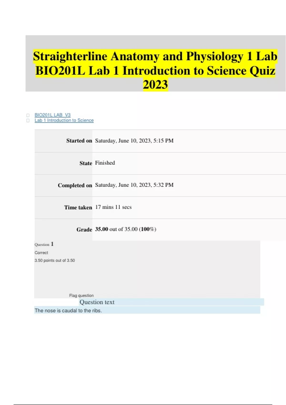Straighterline Anatomy and Physiology 1 Lab BIO201L Lab 1 Introduction to Science Quiz 2023