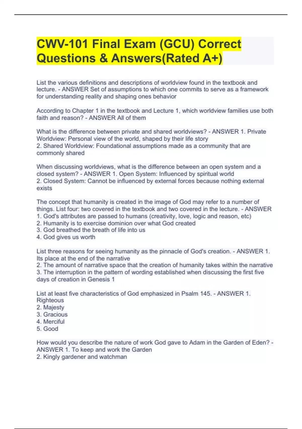 PACKAGE DEAL FOR CWV-101 Final Exam Review| Correct Questions| Answers| VerifiedPACKAGE DEAL FOR CWV-101 Final Exam Review| Correct Questions| Answers| Verified PACKAGE DEAL FOR CWV-101 Final Exam Review| Correct Questions| Answers| VerifiedPACKAGE DEAL FOR CWV-101 Final Exam Review| Correct Questions| Answers| Verified