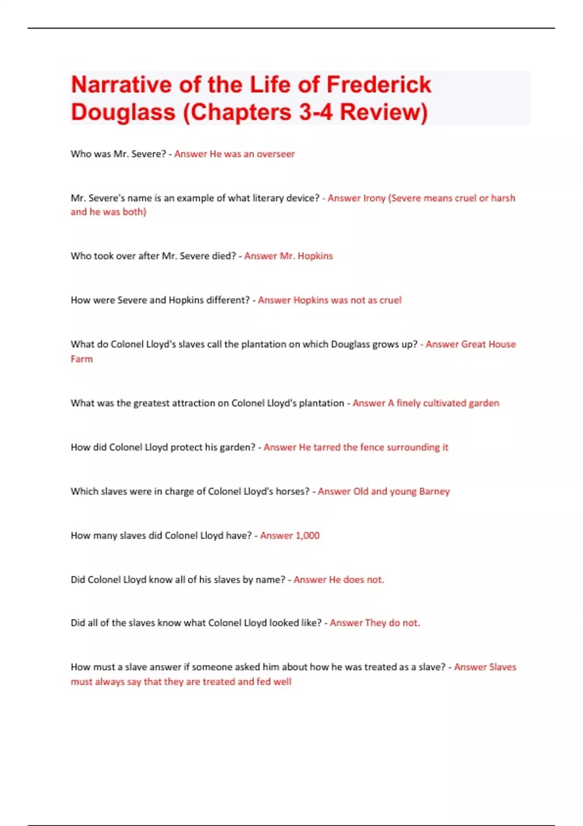 Narrative of the Life of Frederick Douglass (Chapters 3-4 Review) Questions And Answers Already Graded A+