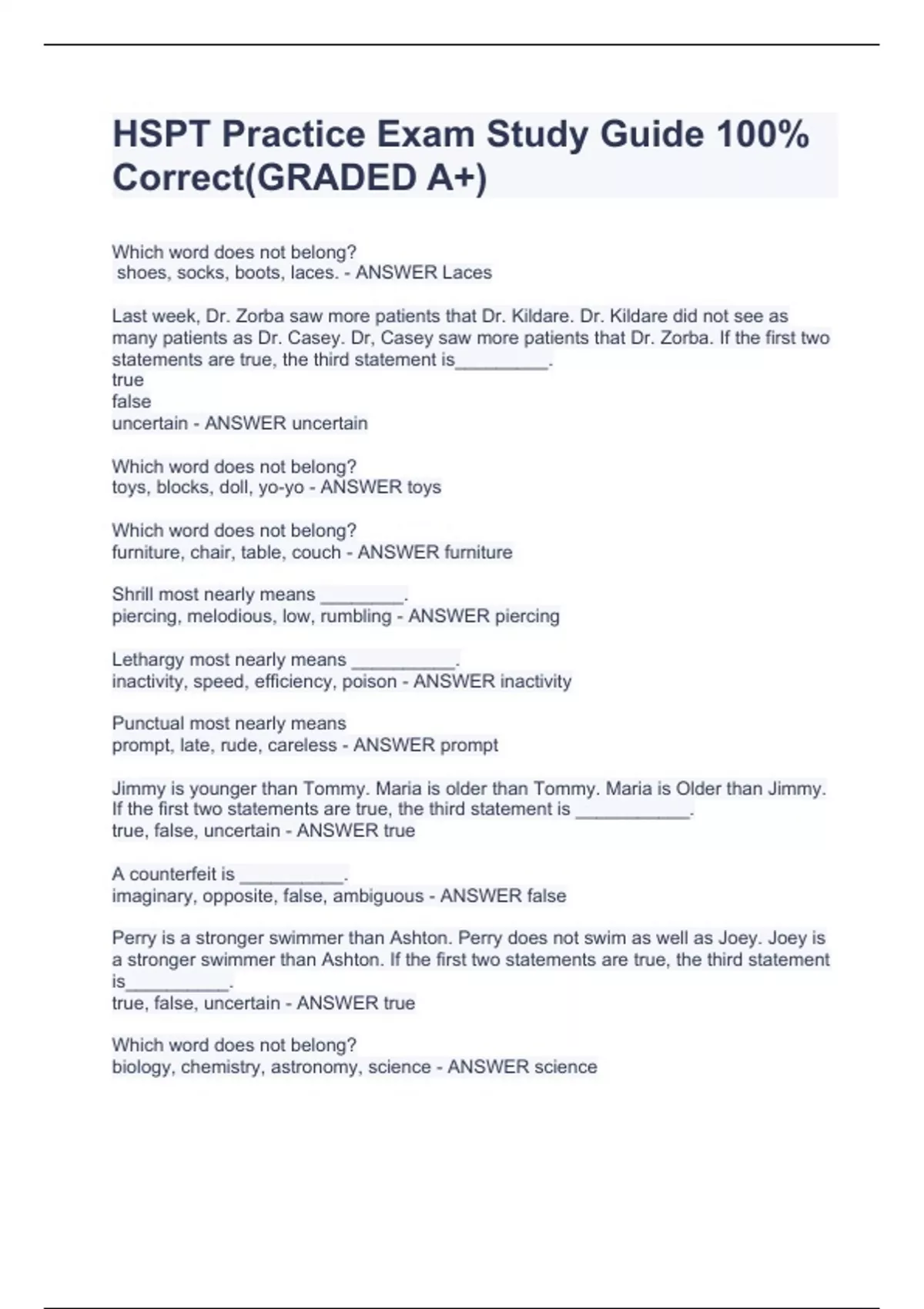 HSPT Practice Exam Study Guide 100% Correct(GRADED A+)