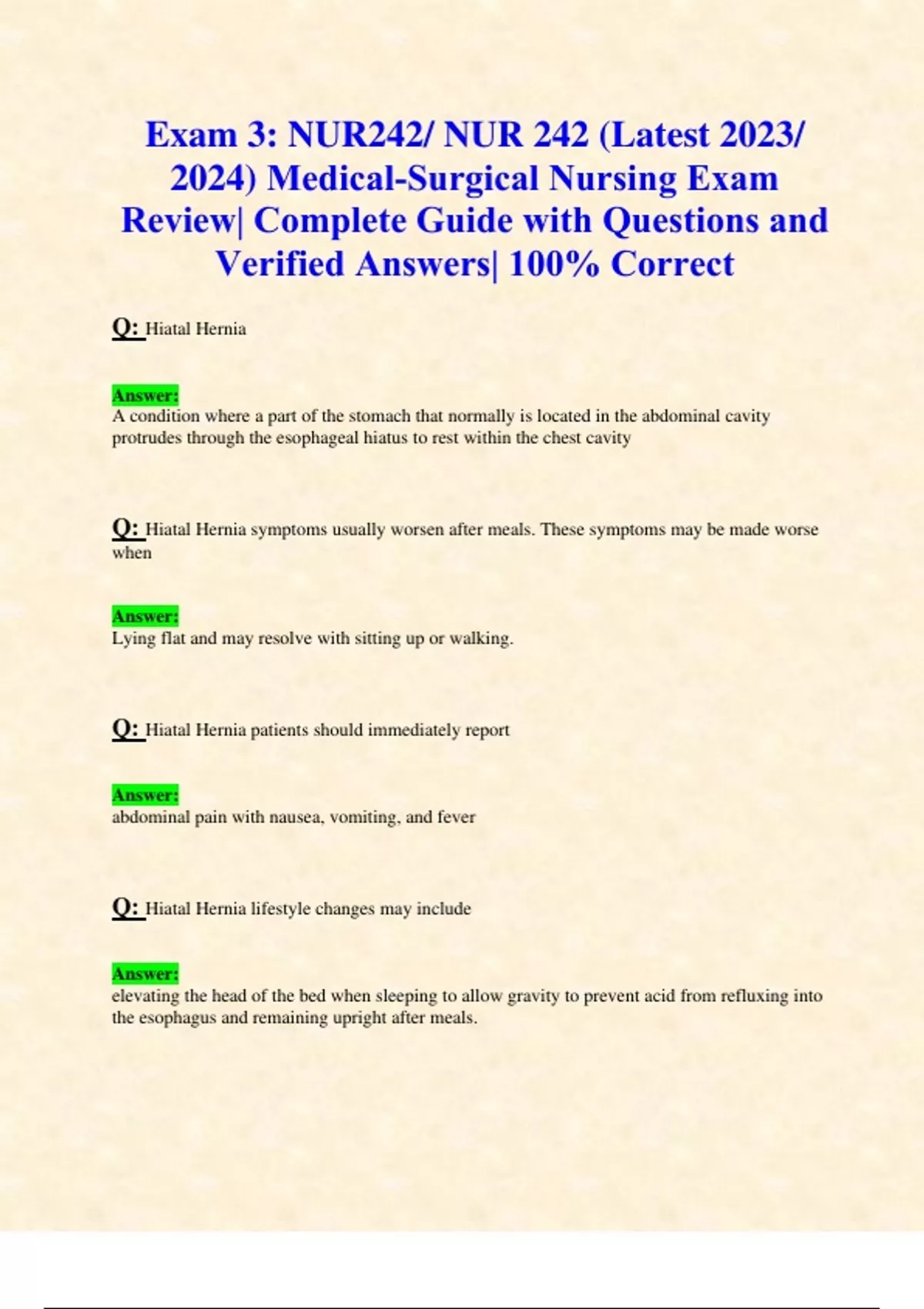 Exam 3: NUR242/ NUR 242 (Latest 2023/ 2024 UPDATES STUDY BUNDLE WIH COMPLETE SOLUTIONS) Medical-Surgical Nursing Exams | Questions and Verified Answers| 100% Correct| Grade A- Galen