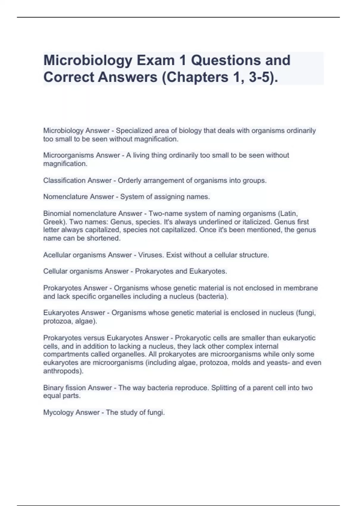 Microbiology Exam 1 Material with Questions and Answers.,Microbiology Exam 1 Review Test Correctly Answered.,Microbiology Exam 1 Questions with 100% correct Answers (Pearson).,Microbiology Exam 1Questions and Correct Answers -FAU,Microbiology Exam #1 Questions and Correct Microbiology Practice Exam QuestiMicrobiology Exam 1 Q$A OLEMISS.,Solutions.,