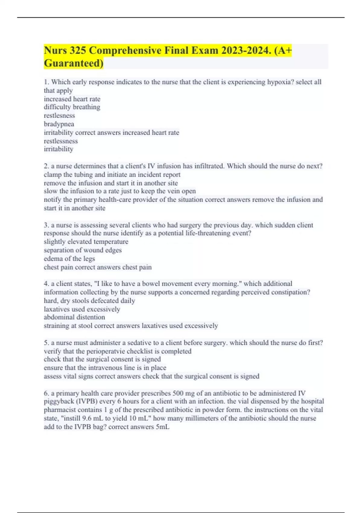 Nurs 325 Comprehensive Final Exam . (A+ Guaranteed) NURS 325 Psychiatric and Mental Health Nursing (100% Verified Solutions) . NURS 325 Exam 2 Review Questions & Answers. () Graded A+ Already. NURS 325 Midterm 2024 (100% Correct Answers) NURS 325 EXAM 1 PT 2 (All Answered Accurately) . NURS 325 - Adults: [2024] E