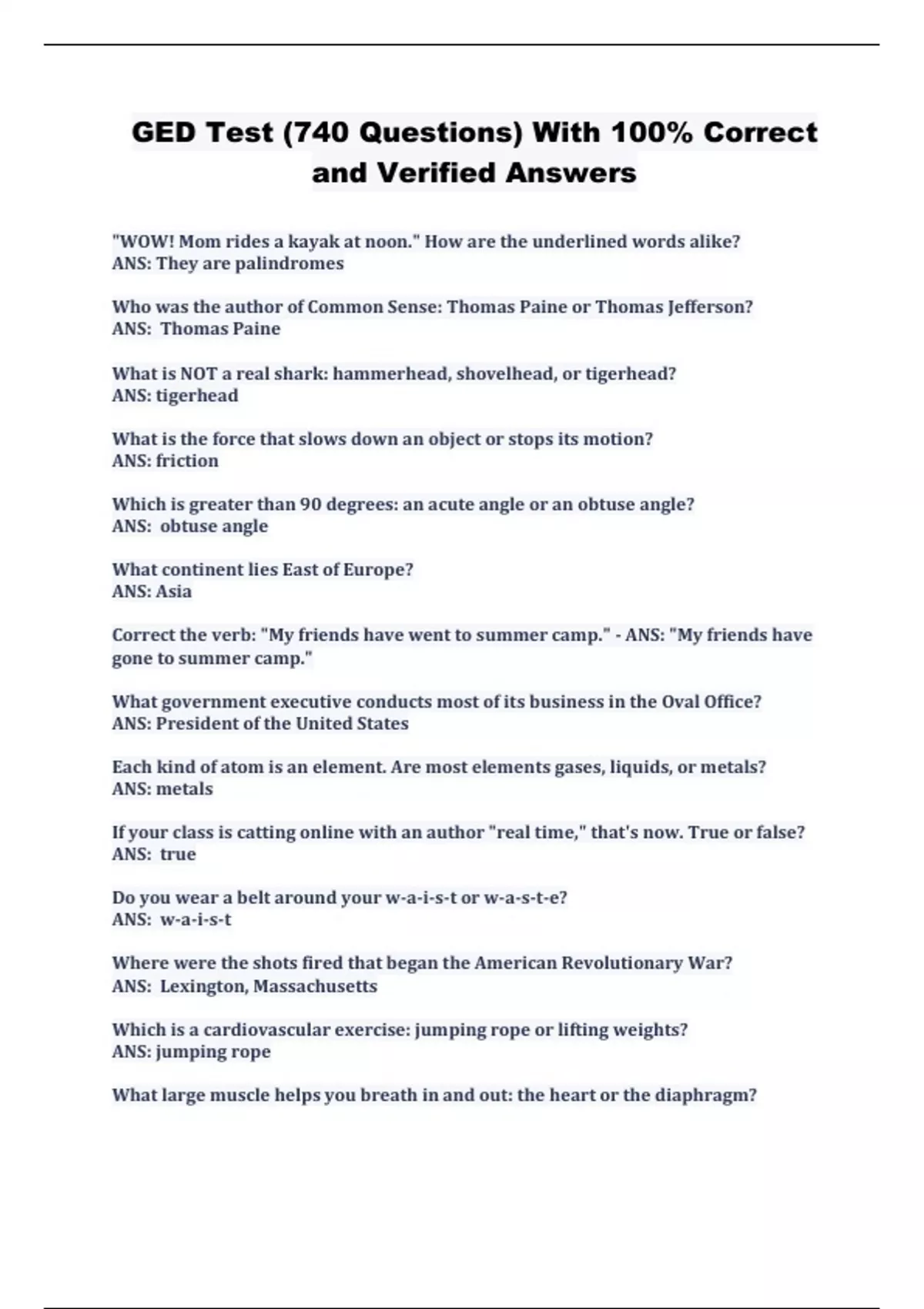 GED Test (740 Questions) With 100% Correct and Verified Answers