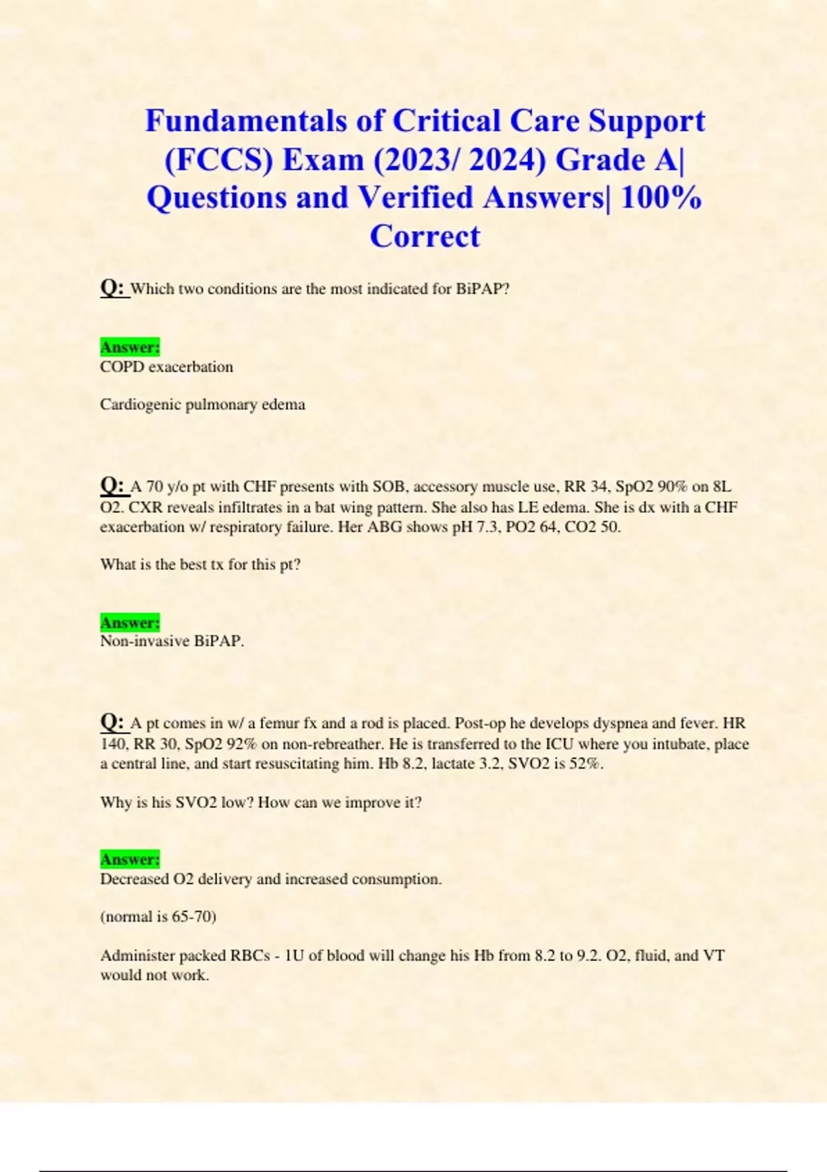 Fundamentals of Critical Care Support (FCCS) Exam | Grade A| Questions and Verified Answers| 100% Correct (Latest 2023/ 2024 Update )