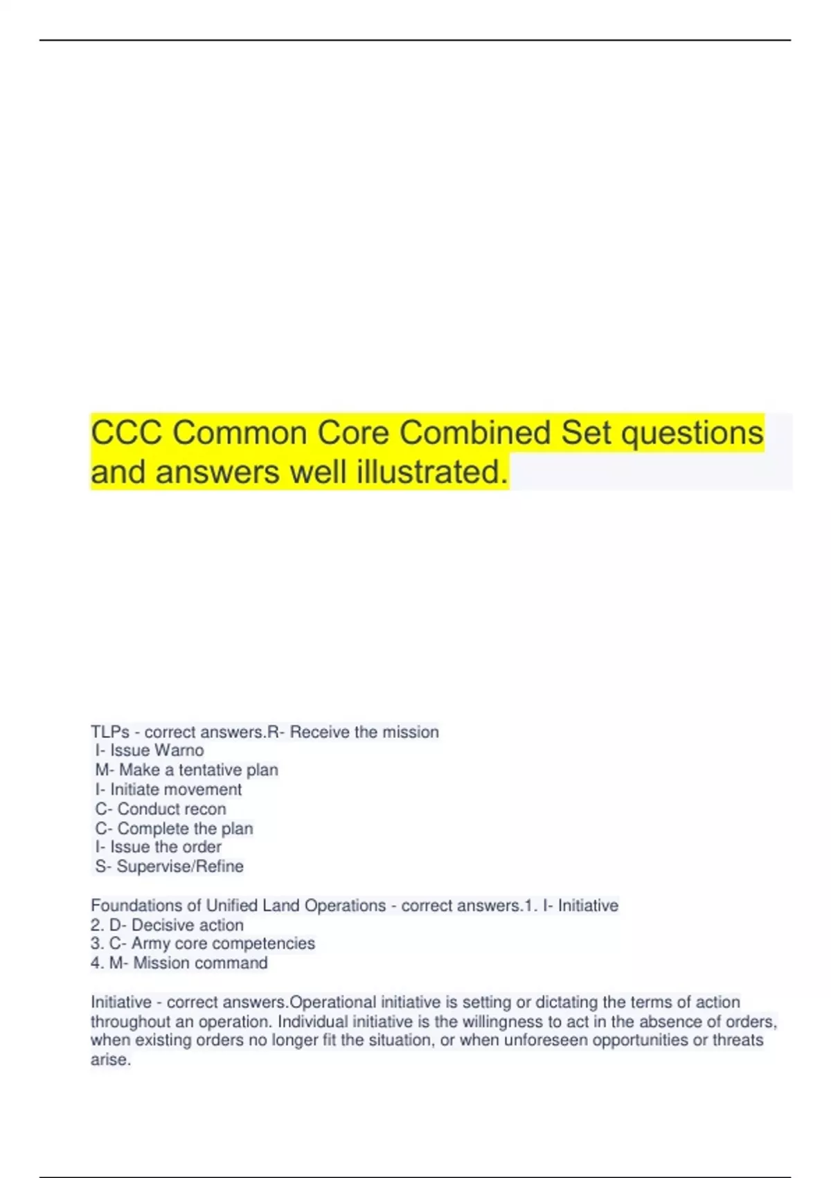 Pre Assessment Signal Captain Career Course questions and answers 100% guaranteed success.Updated Maneuver Captains Career Course Entrance Exam questions and answers well illustrated.MCCC Entrance Exam questions and answers 100% verified.Army CCC - Common core - Mission Command FM6-0 questions and answers well illustrated.