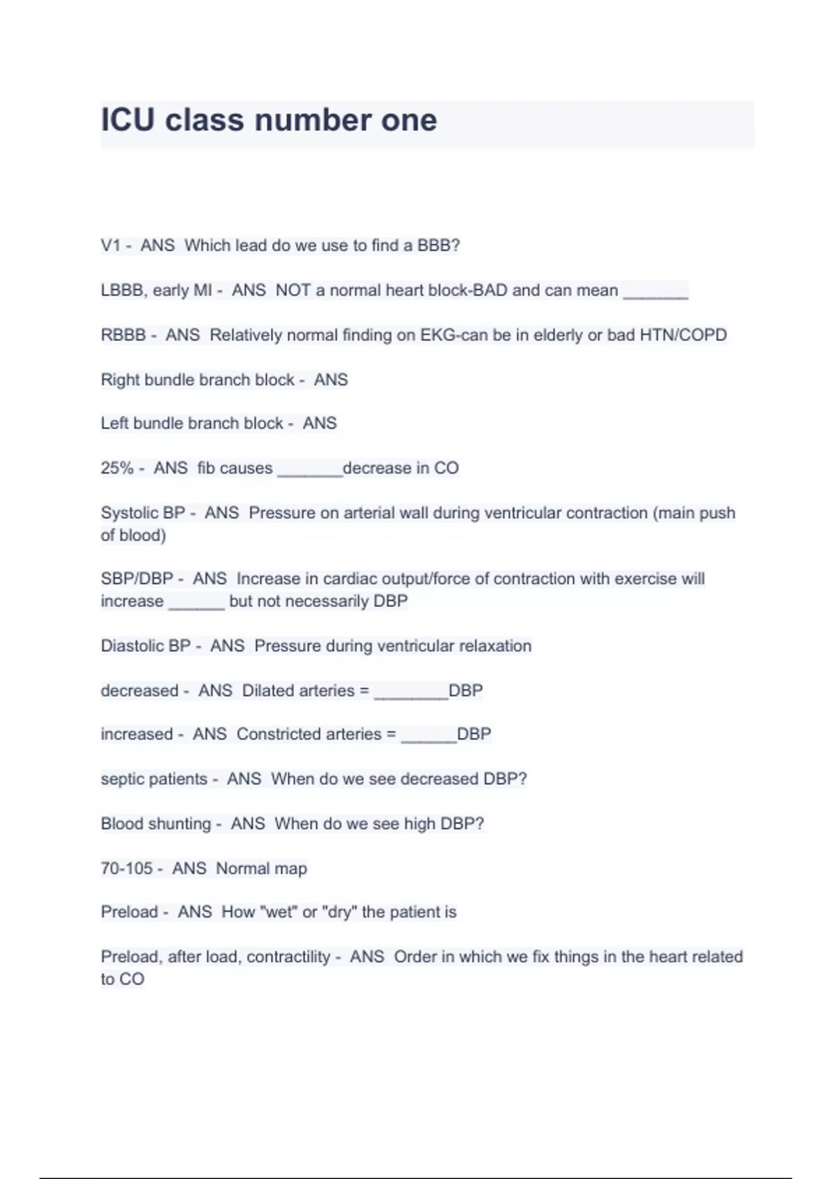 ICU class number one Exam Questions And Answers