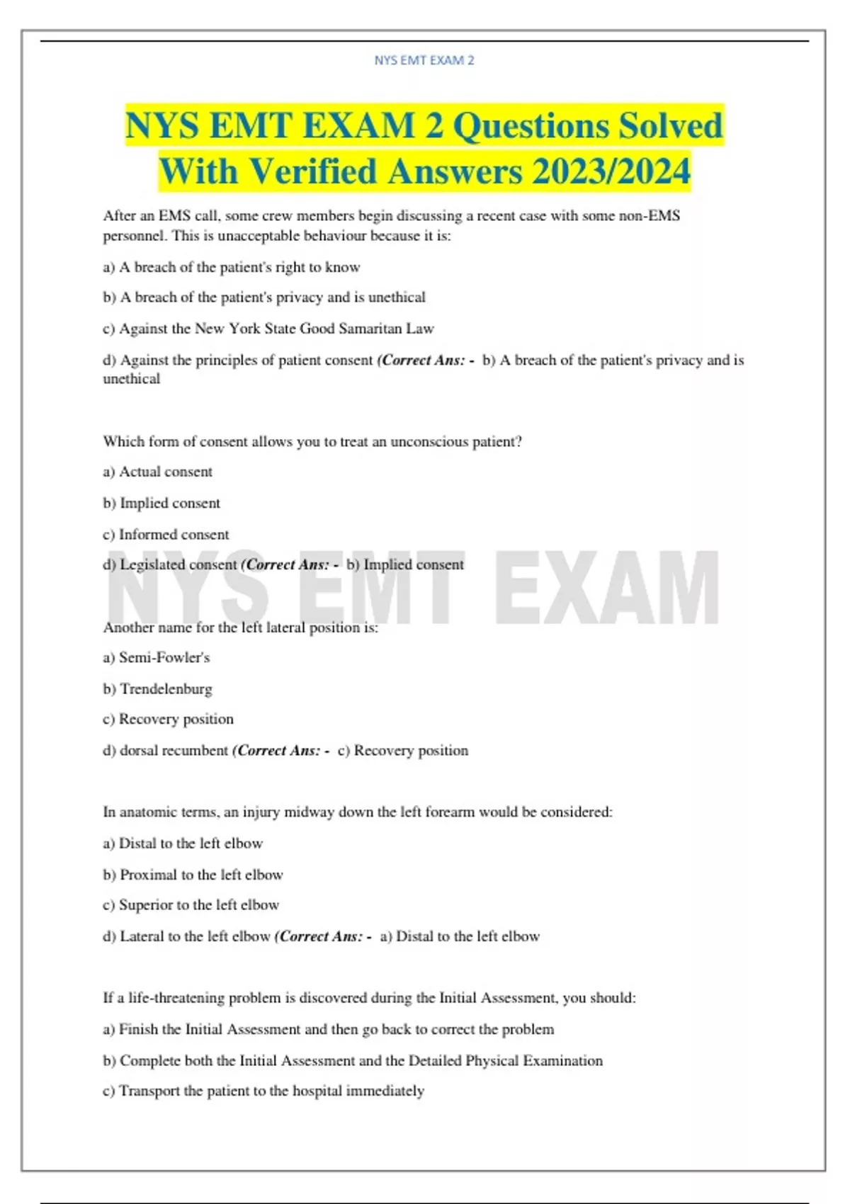 All; NYS EMT Written Exams/ NYS EMT Exams/ Questions with Complete Solutions _2023/2024,All; NYS EMT Written Exams/ NYS EMT Exams/ Questions with Complete Solutions _2023/2024