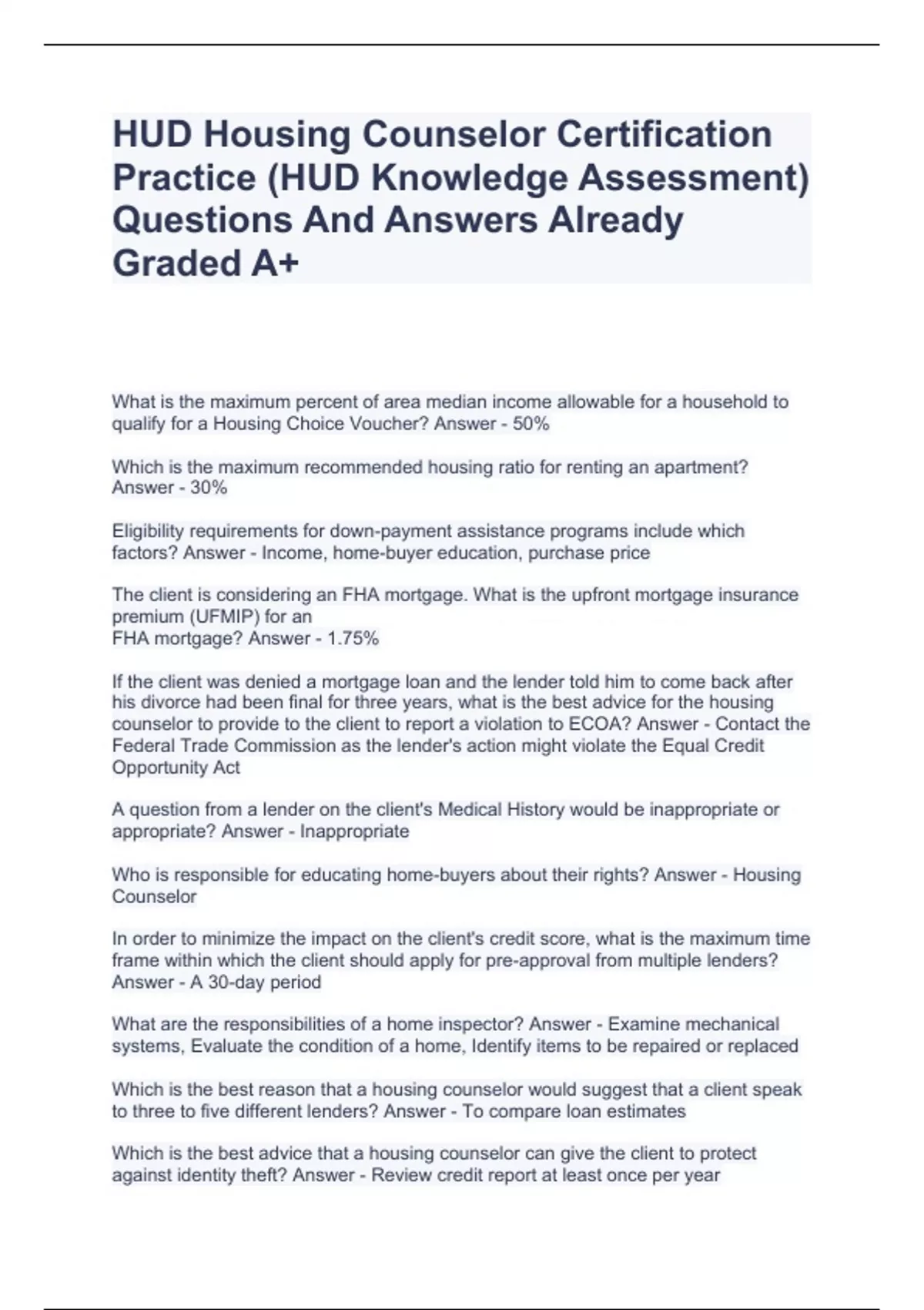 HUD Housing Counselor Certification Practice (HUD Knowledge Assessment) Questions And Answers Already Graded A+,HUD Housing Counselor Exam Questions With Complete Solutions.,HUD Housing Counseling Exam Correctly Solved 100% Correct!!,HUD Housing Counseling (HUD Housing Counseling Certification Exam) Latest Questions With Correct Answers.,Housing Co