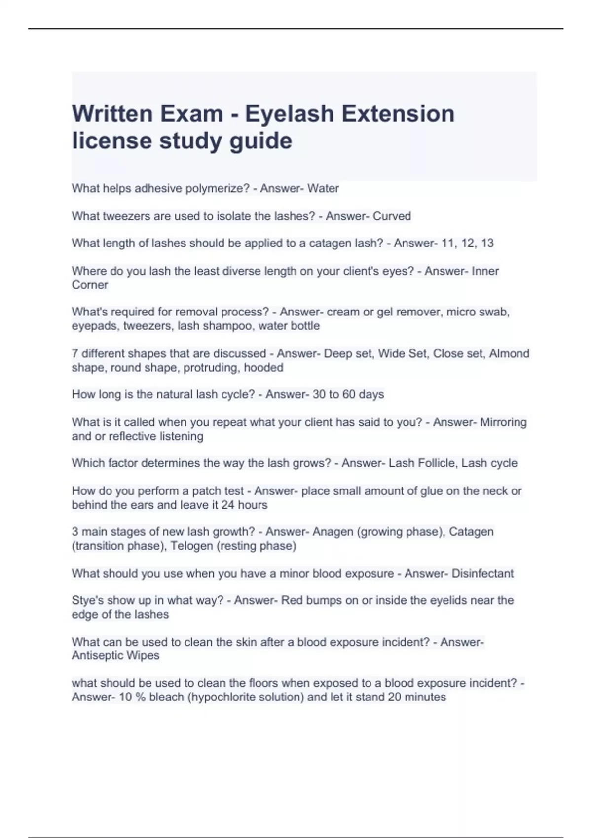Exam (elaborations) Written Exam - Eyelash Extension license study guide Latest updated 2 Exam (elaborations) TDLR Eyelash extensions Exam Questions with correct Answers 3 Exam (elaborations) TDLR Eyelash Extension review Exam Questions and Answers 4 Exam (elaborations) TDLR Eyelash Extension Practical Exam Questions and Answers 5 Exam (elabora