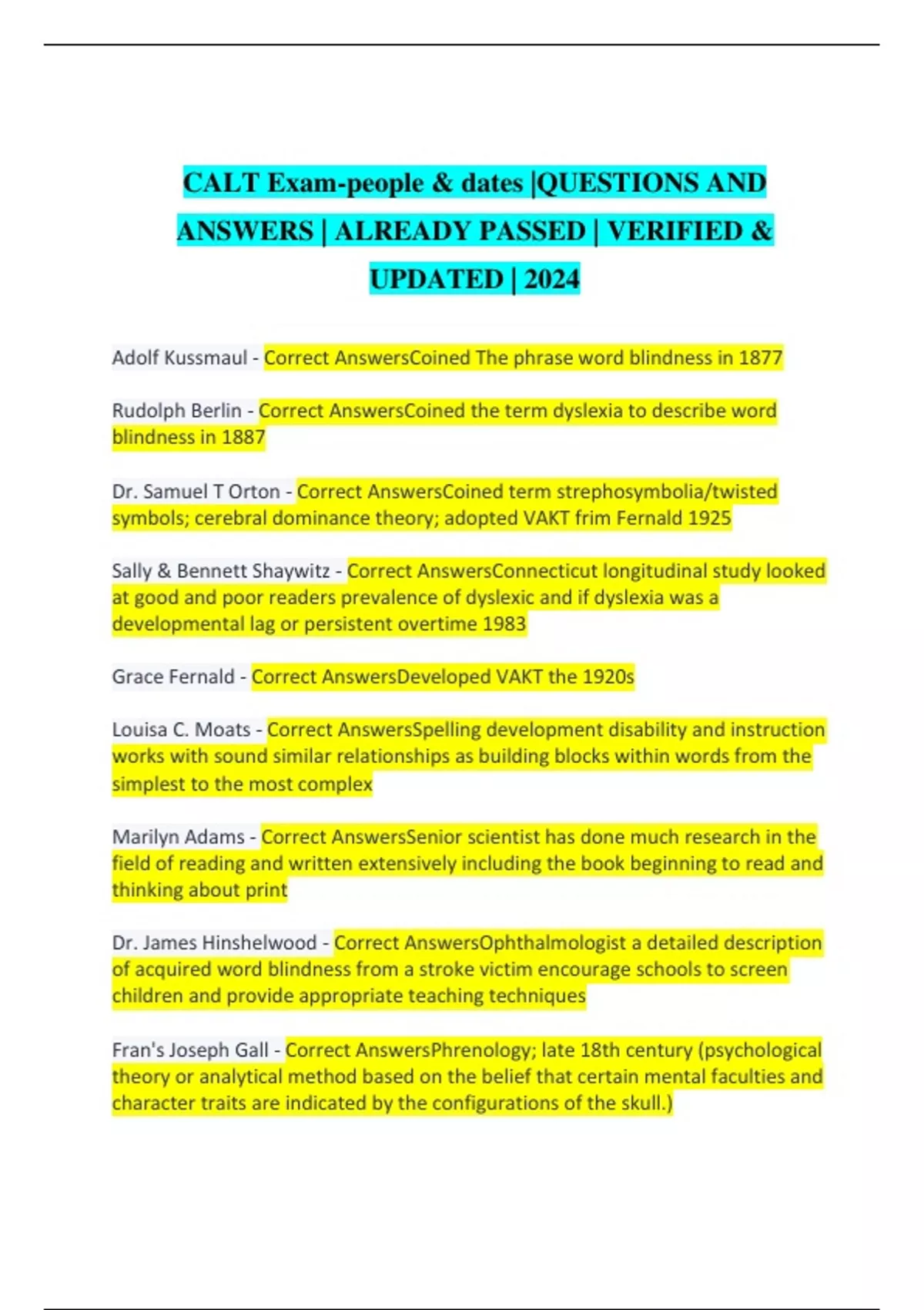 CALT Exam-people & dates |QUESTIONS AND ANSWERS | ALREADY PASSED | VERIFIED & UPDATED | 2024