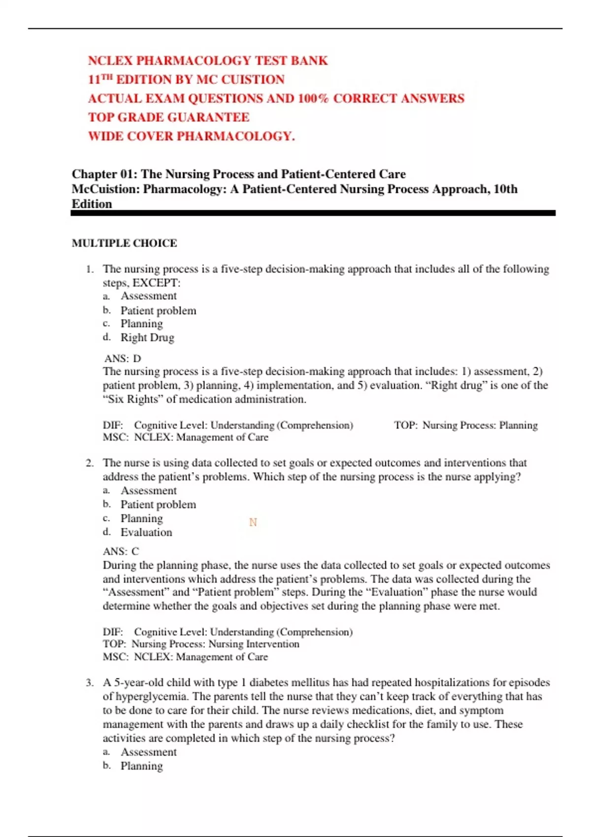 NCLEX PHARMACOLOGY TEST BANK 11TH EDITION BY MC CUISTION ACTUAL EXAM QUESTIONS AND 100% CORRECT ANSWERS TOP GRADE GUARANTEE WIDE COVER PHARMACOLOGY.