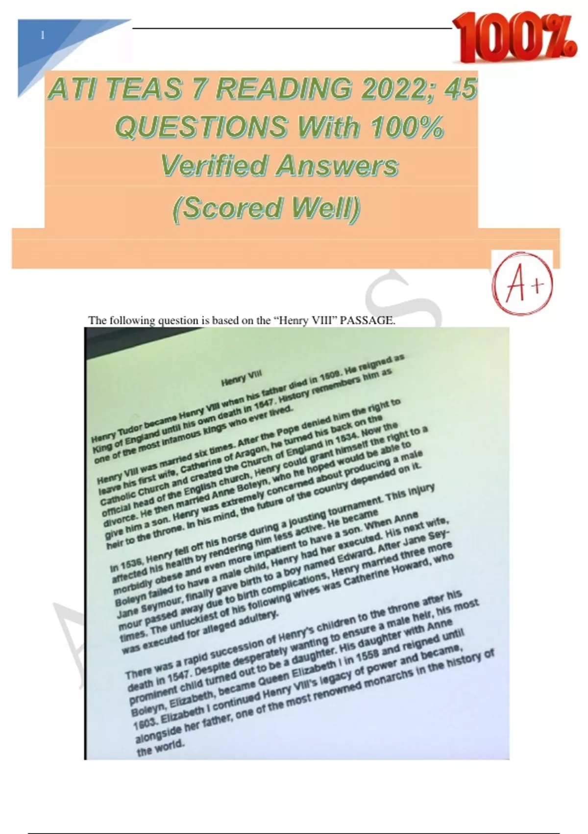 Complete; ATI TEAS 7 READING|ATI TEAS 7 Exam| ATI TEAS 7 Math| ATI TEAS: English And Language| TEAS 7 Test Science Questions With Complete Solutions 2023/2024 Graded A+.