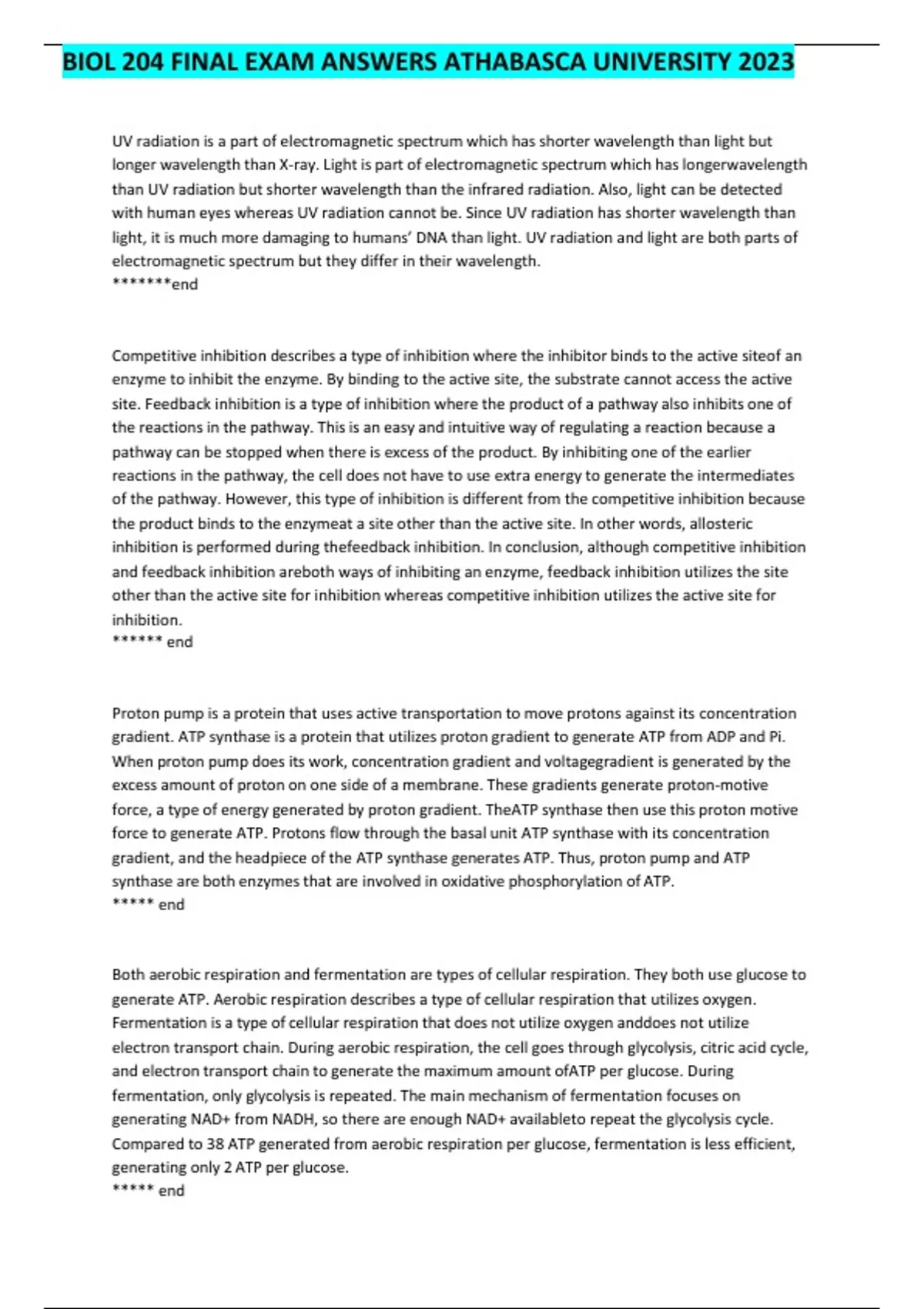 COMBINED SOLUTIONS BIOL 204 Fermentation Lab Report, BIOL 204 LAB REPORT 1 EFFECTS OF OSMOSIS ON MODEL CELL, BIOL 204 Enzyme Lab (Acidic pH Decreases the Rate of Enzyme Activity by Amylase Hydrolysis in a Starch Solution), BIOL 204 Assignment 3 A (A–G), BIOL 204 FINAL EXAM ANSWERS ATHABASCA UNIVERSITY