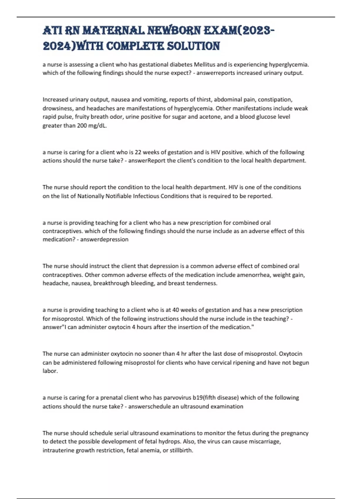 ATI RN maternal newborn Exam()with complete solution a nurse is assessing a client who has gestational diabetes Mellitus and is experiencing hyperglycemia. which of the following findings should the nurse expect? - answerreports increased urinar