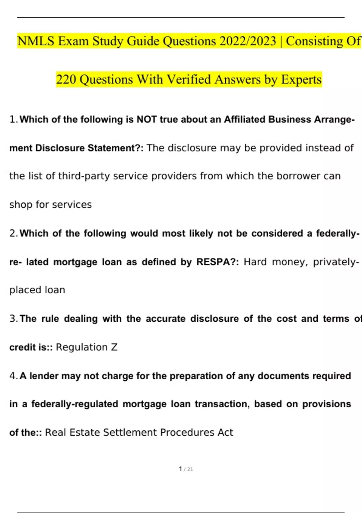 NMLS Exam Study Guide Questions 2022/2023 | Consisting Of 220 Questions With Verified Answers From Experts