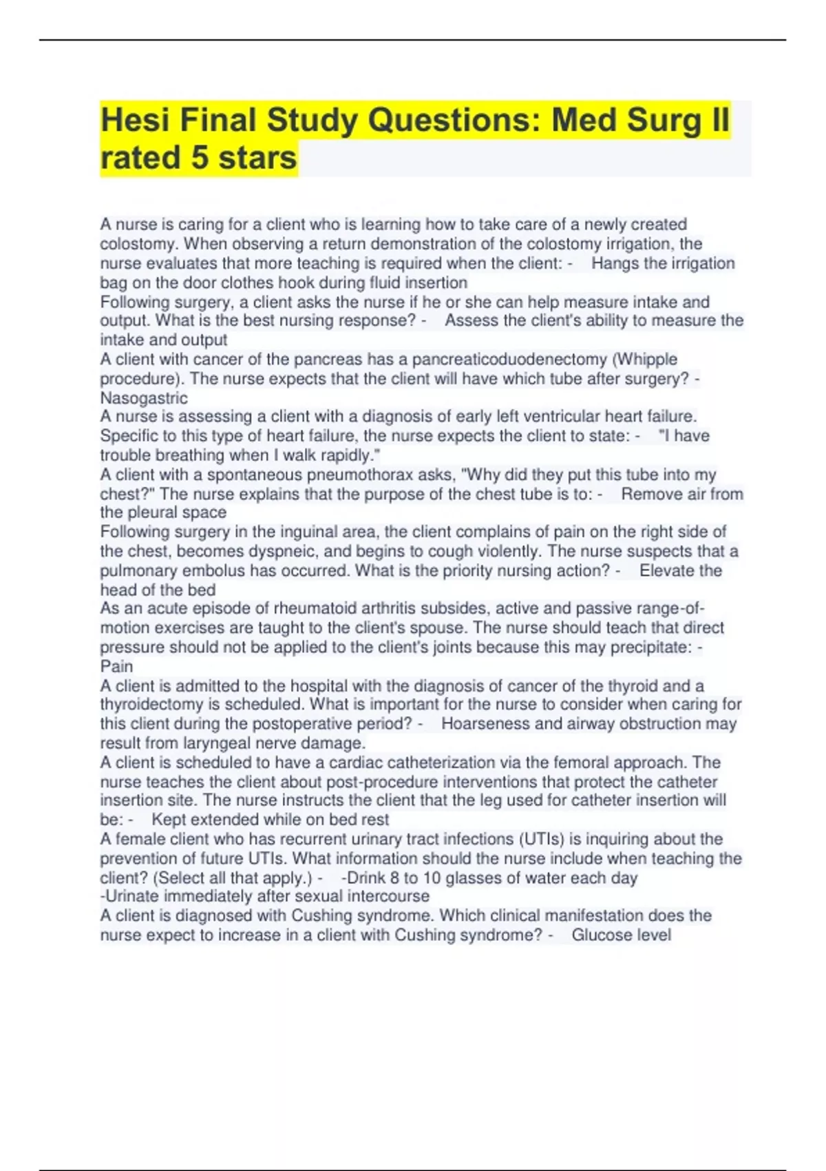 MED SURG HESI EXAM QUESTIONS WITH All Answers Verified Correct 2 Exam (elaborations) Exit HESI Test Bank (answered) spring 2023. 3 Exam (elaborations) 2022-23 Med-Surg HESI Practice Questions verified downloads 4 Exam (elaborations) Med-Surg II HESI Test Bank questions and answers verified 100%