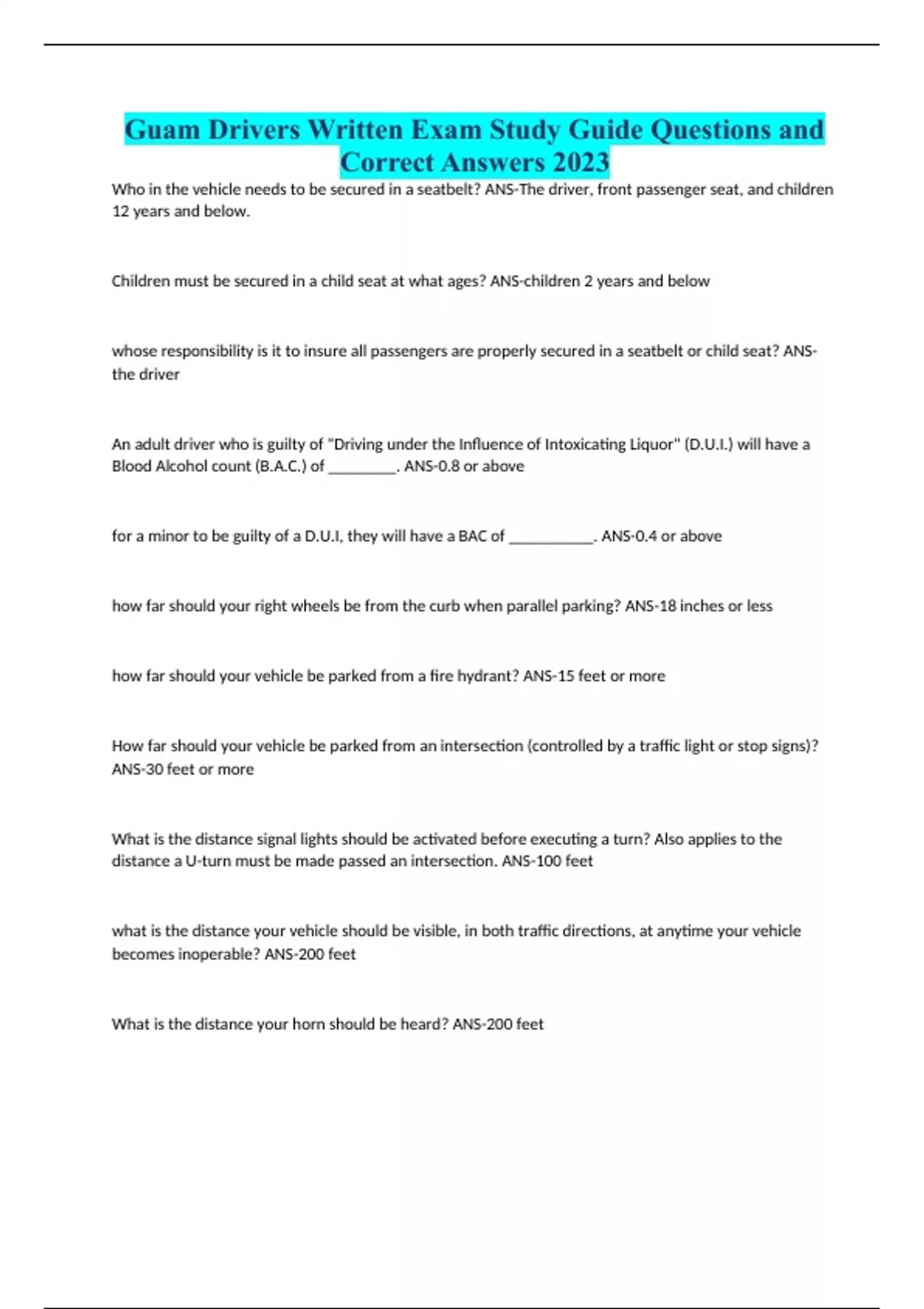 Guam Driving Practice Test Questions with Correct Answers/Motorcycle test for guam Questions with Complete Solutions/Guam Driver s Handbook study guide Questions with Correct Answers 100% Verified 2023/202