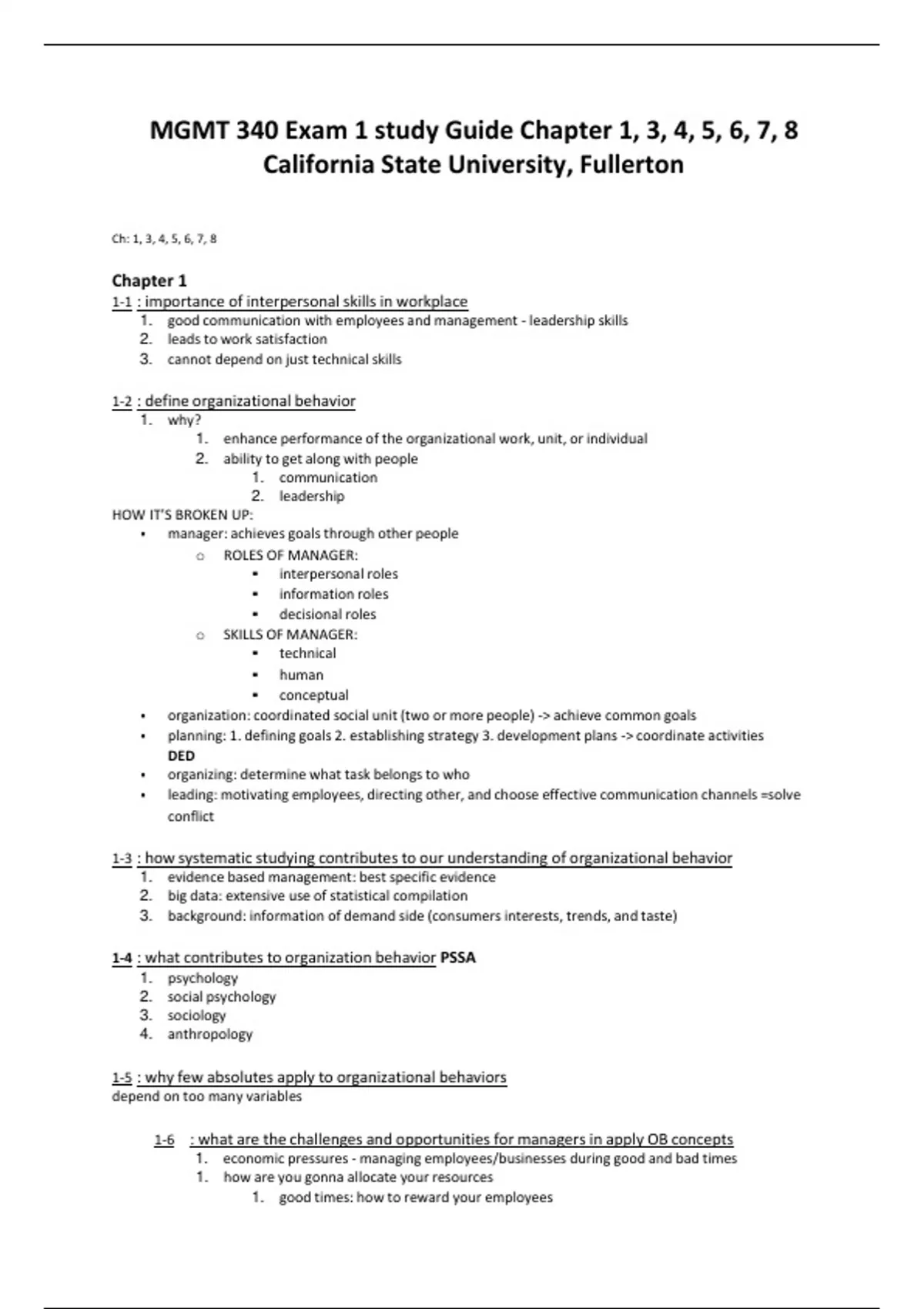 MGMT 340 Exam 1 study Guide Chapter 1, 3, 4, 5, 6, 7, 8 California State University, Fullerton
