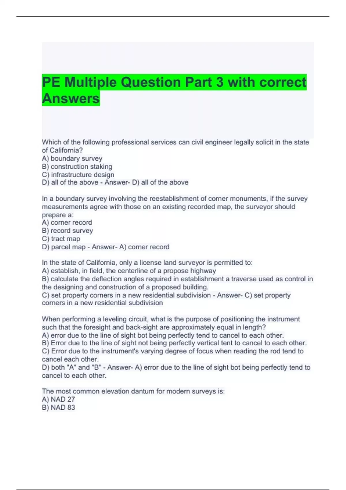PE Multiple Question Part 3 with correct Answers 2 Exam (elaborations) PE License Information Exam Questions and Answers 3 Exam (elaborations) PE Exam 2023 Questions and Answers 4 Exam (elaborations) PE Exam - Construction Depth Questions and Answers 5 Exam (elaborations) PE Exam - Civil Breadth Questions and Answers-Graded A 6 Exam (elaborati