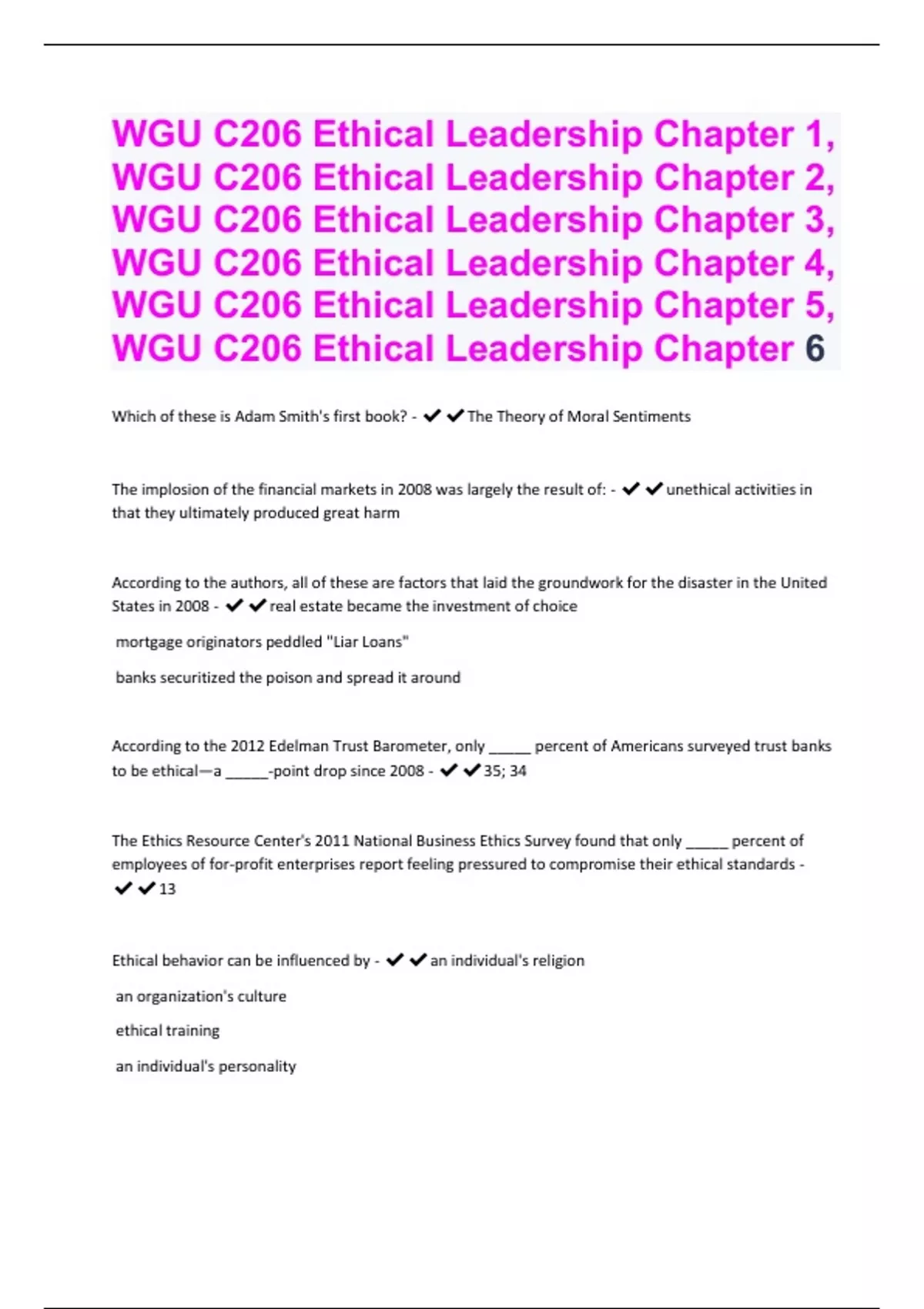 WGU C206 Ethical Leadership Chapter 1, WGU C206 Ethical Leadership Chapter 2, WGU C206 Ethical Leadership Chapter 3, WGU C206 Ethical Leadership Chapter 4, WGU C206 Ethical Leadership Chapter 5, WGU C206 Ethical Leadership Chapter 6 Questions With Complet