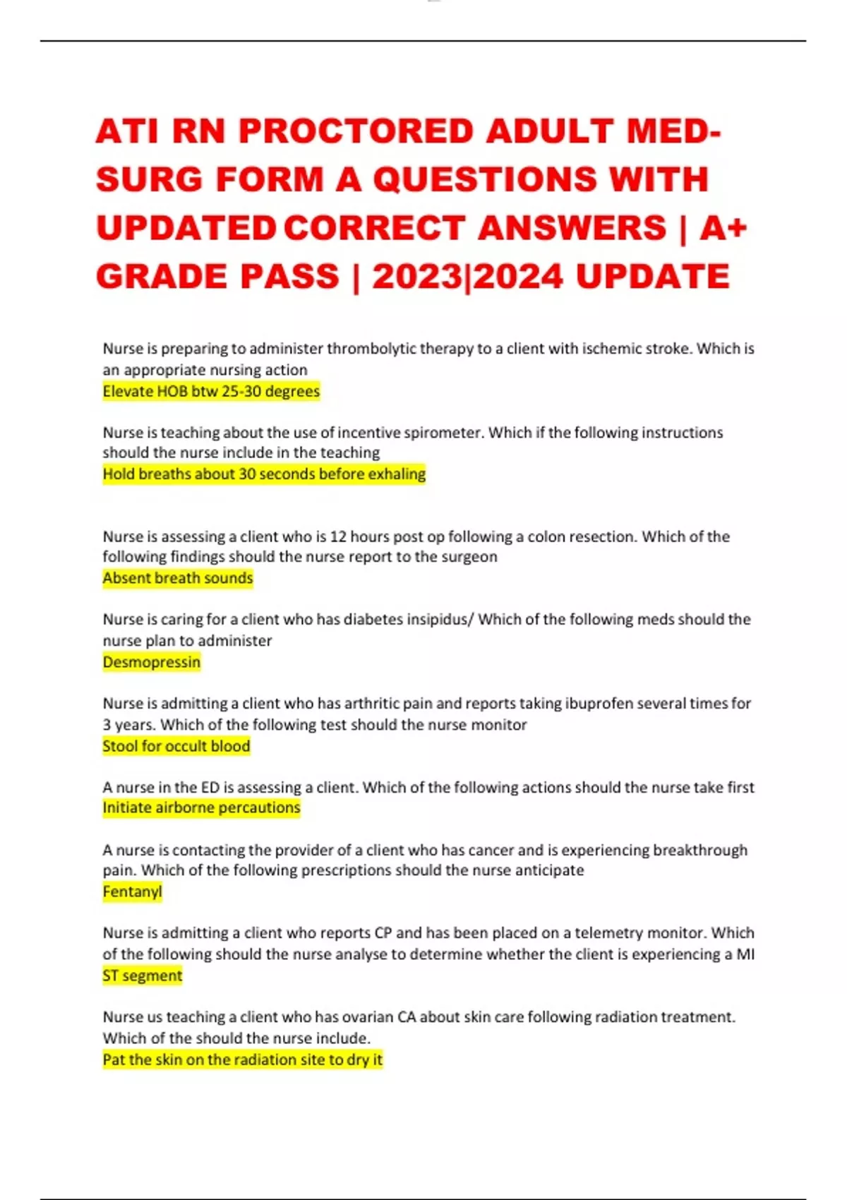 ATI RN PROCTORED ADULT MEDSURG FORM A QUESTIONS WITH UPDATED CORRECT ANSWERS | A+ GRADE PASS | 2023|2024 UPDATE