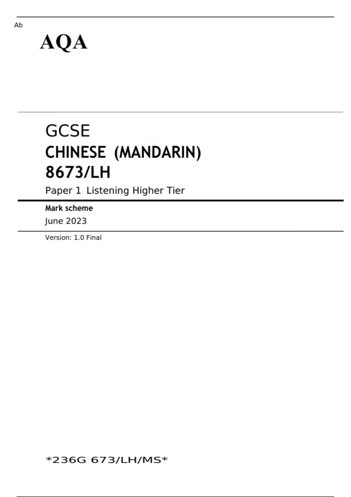 AQA GCSE CHINESE (MANDARIN) Foundation Tier Paper 1 JUNE 2023 QUESTION PAPER and MARK SCHEME