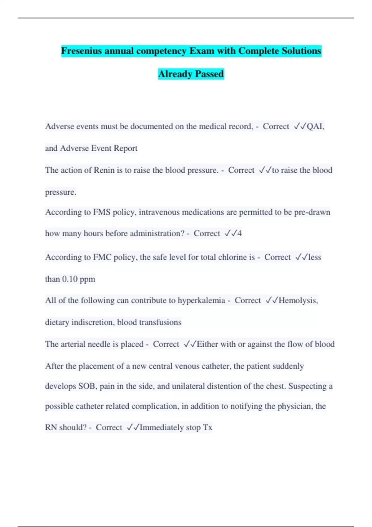 Fresenius Annual Exam Questions & Answers Already Passed
