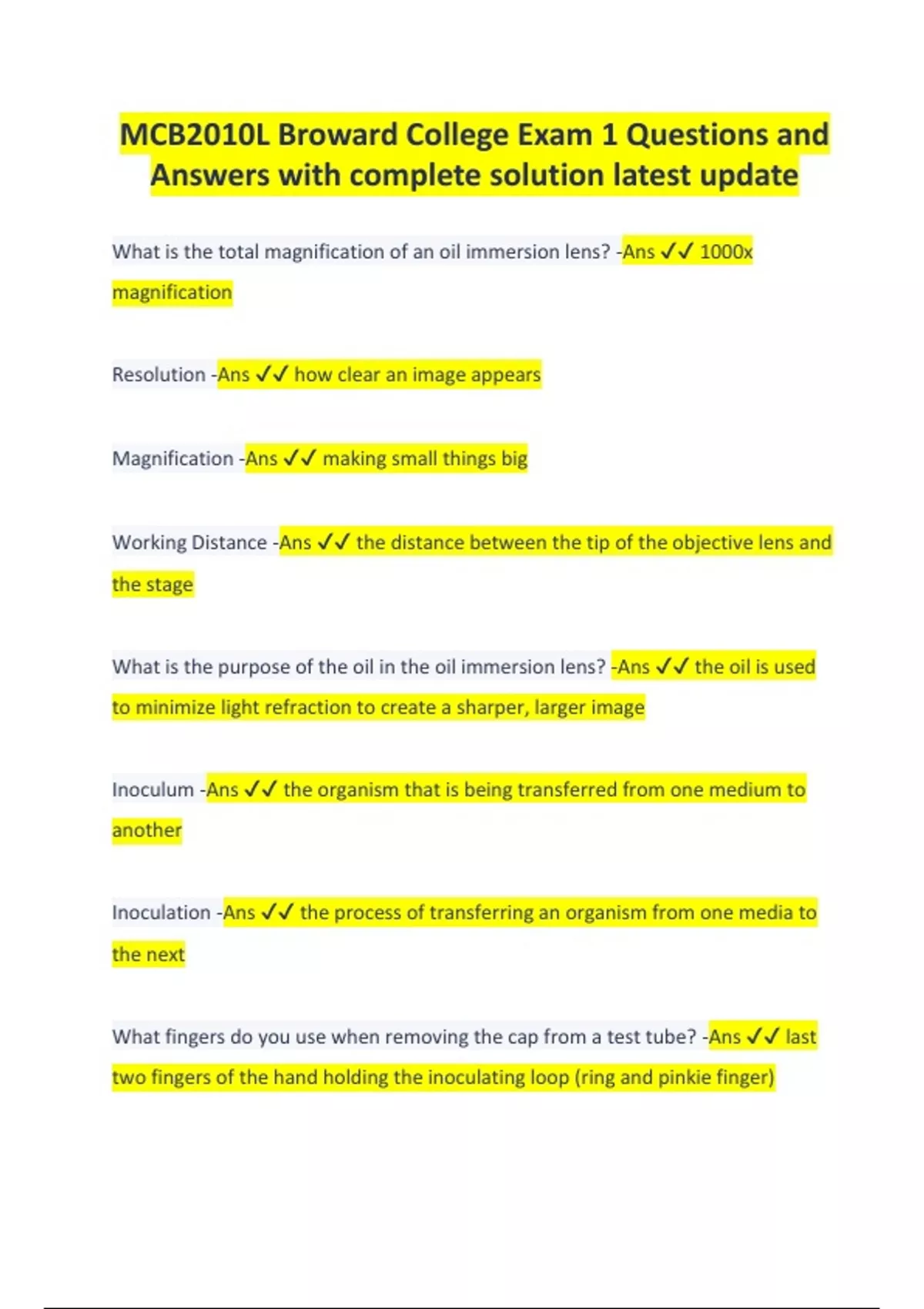 MCB2010L Broward College Exam 1 Questions and Answers with complete solution latest update