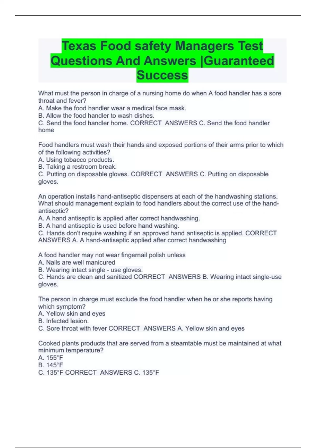 Texas Food safety Managers Test Questions And Answers |Guaranteed Success Texas Food Manager Test Questions And Answers Solved 100% Correct Texas Food Manager Review Questions And Complete Solutions |100% Correct