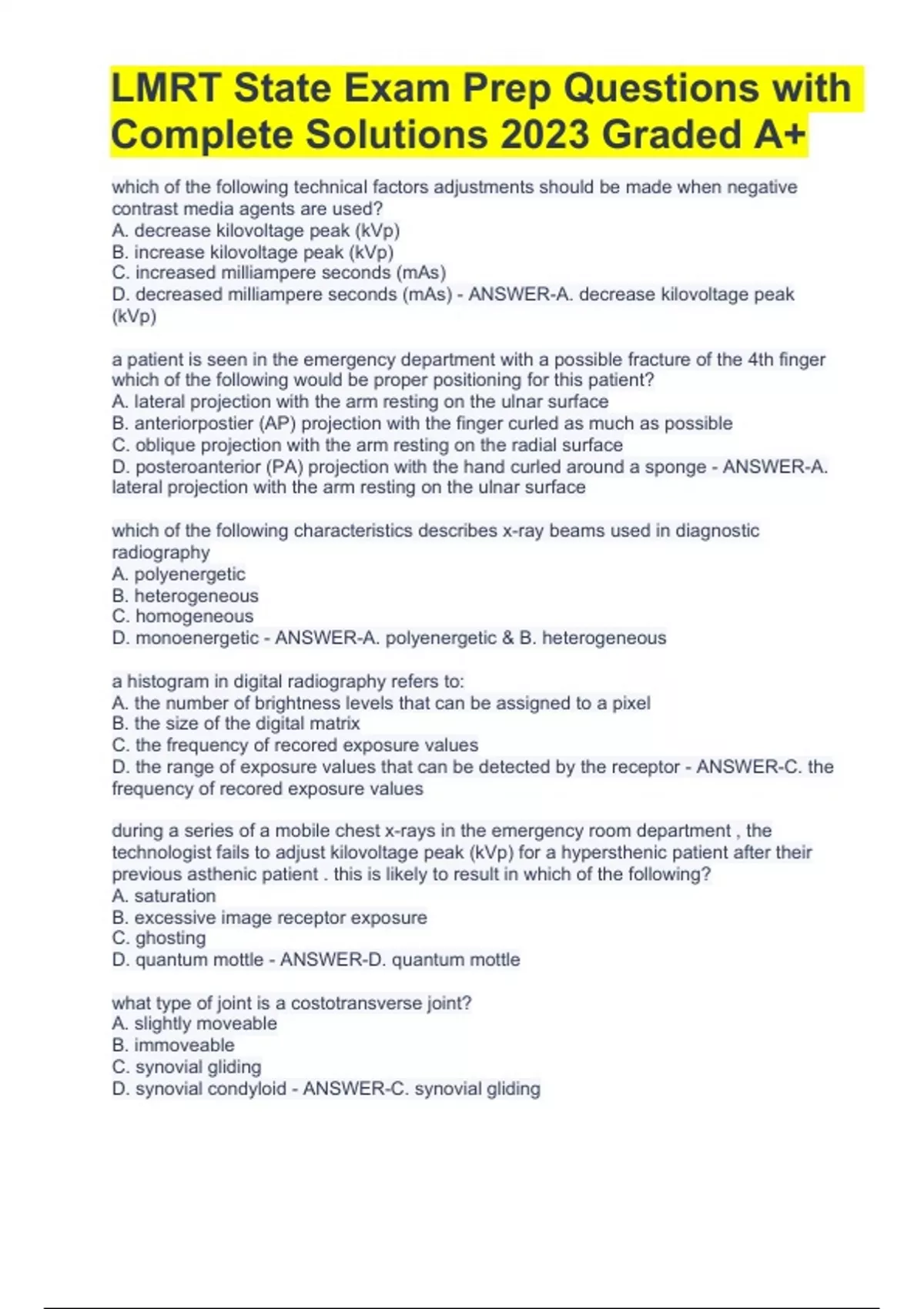 LMRT State Review Exam |138 Questions With Answers Graded A+, LMRT Core & Patient Care Exam |98 Questions and Answers 2023/2024 Latest Update & LMRT State Exam Prep Questions with Complete Solutions 2023 Graded A+.