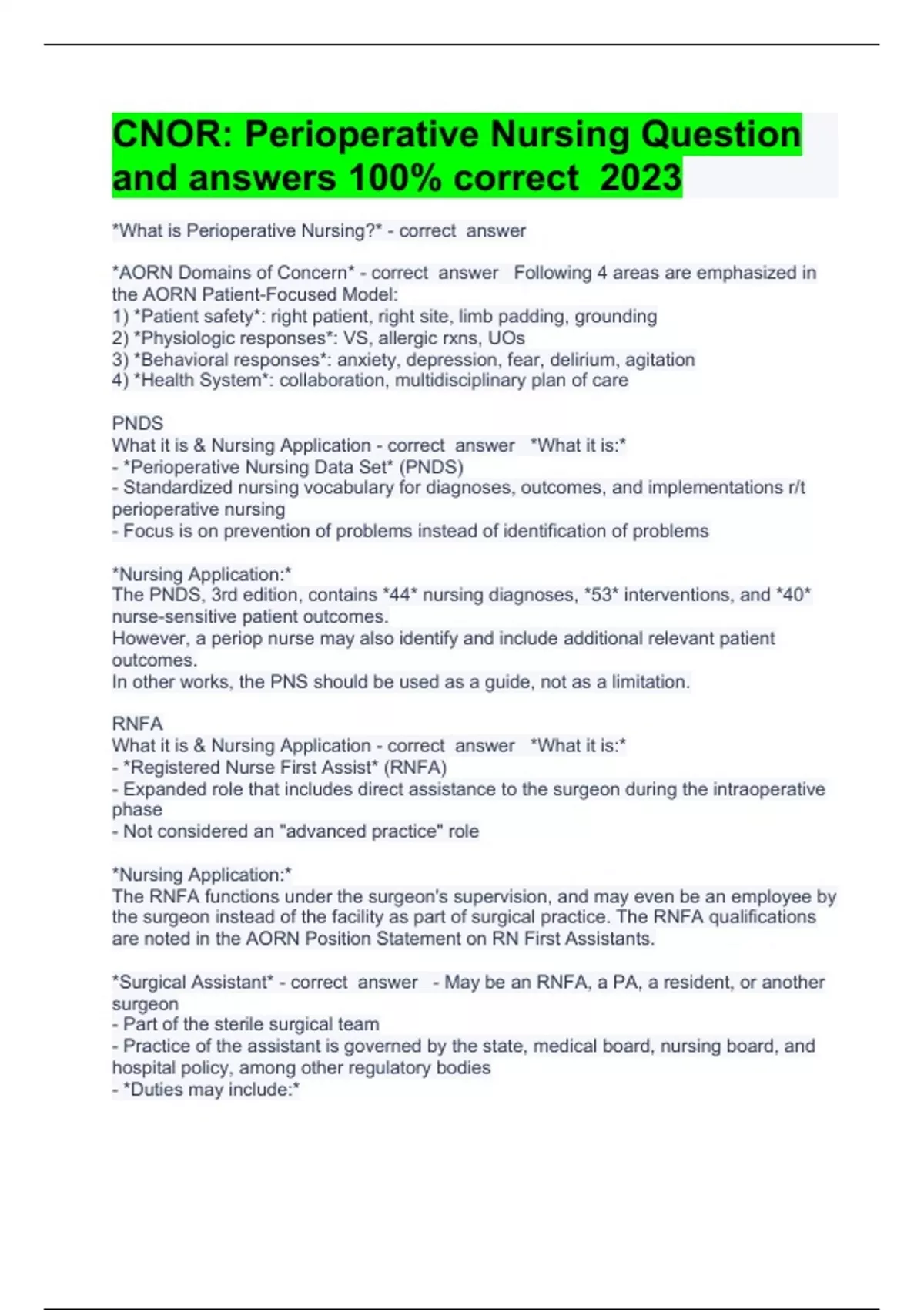 CNOR 200 Question Practice with complete solution 2023/2024 Exam (elaborations) CNOR A Questions with complete solutions 2023/2024 Exam (elaborations) CNOR AORN online test Question and answers already verified 2023/2024 Exam (elaborations) CNOR Certification Prep Questions with complete solution 2023/2024 Exam (elaborations) CNOR Exam Prep