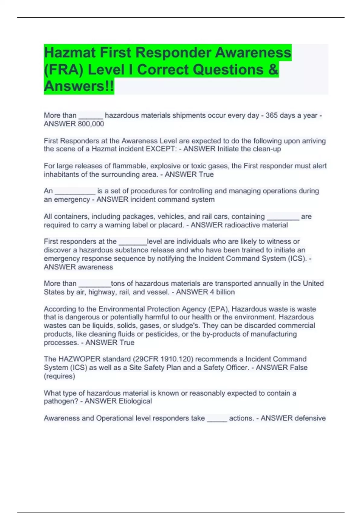 HazMat Prep Exam 1: First Responder Awareness| 75 Questions| Correct Answers(FULL PACK SOLUTIONS)EXAM BUNDLEHazMat Prep Exam 1: First Responder Awareness| 75 Questions| Correct Answers(FULL PACK SOLUTIONS)EXAM BUNDLEHazMat Prep Exam 1: First Responder Awareness| 75 Questions| Correct Answers(FULL PACK SOLUTIONS)EXAM BUNDLEHazMat Prep Exam 1: Fir