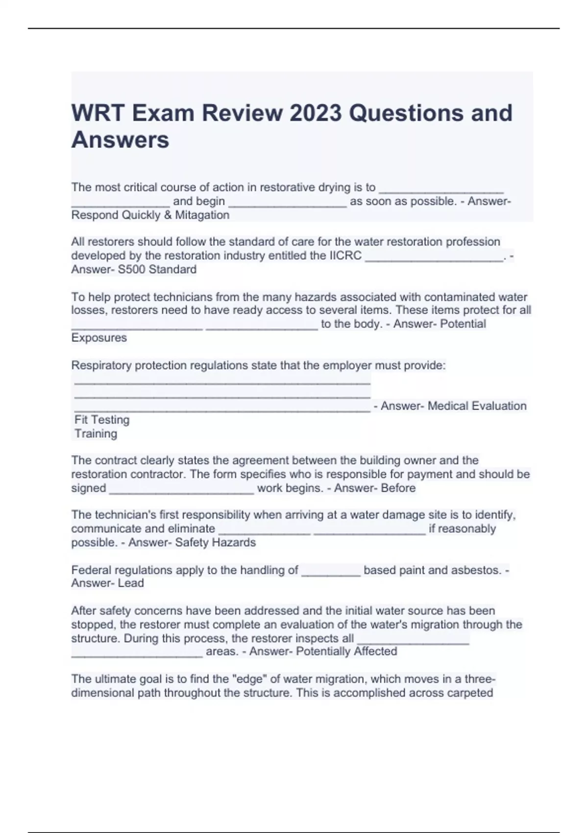 WRT Exam Review 2023 Questions and Answers Graded A 2 Exam (elaborations) WRT EXAM 2023 QUESTIONS AND ANSWERS 3 Exam (elaborations) WRT Certification Exam with correct Answers 100% 4 Exam (elaborations) WATER RESTORATION Exam IICRC Questions and Answers 5 Exam (elaborations) Water damage restoration exam questions and answers 6 Exam (elaborati