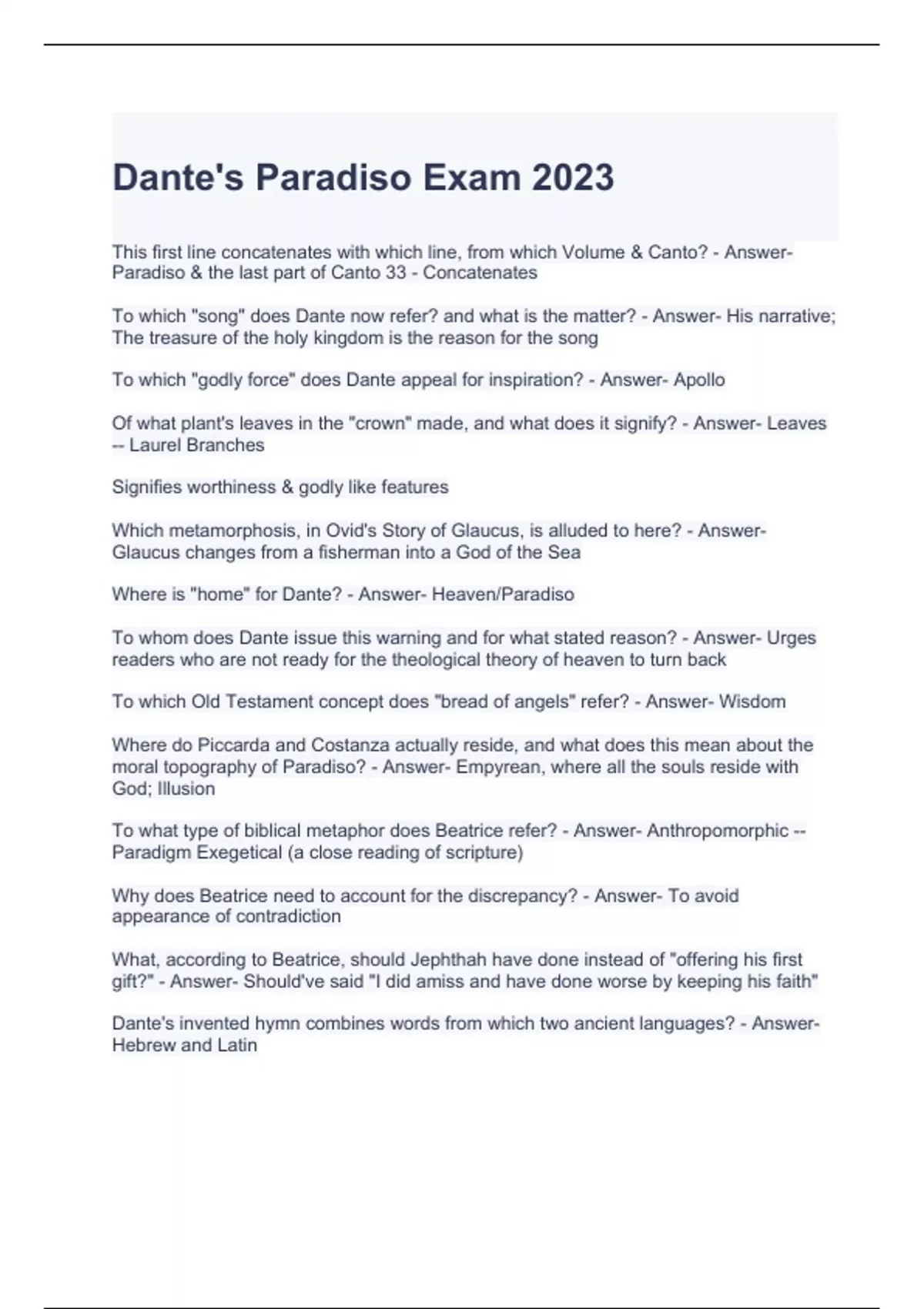 Dante s Paradiso Exam 2023 Questions and Answers (Graded A) 2 Exam (elaborations) Dantes inferno test 2023 questions with correct answers 3 Exam (elaborations) Dante s Inferno- Final Exam with 100% correct Answers 4 Exam (elaborations) Dante Test with complete solutions 5 Exam (elaborations) Dante Test 2023 Questions and Answers 6 Exam (elabor