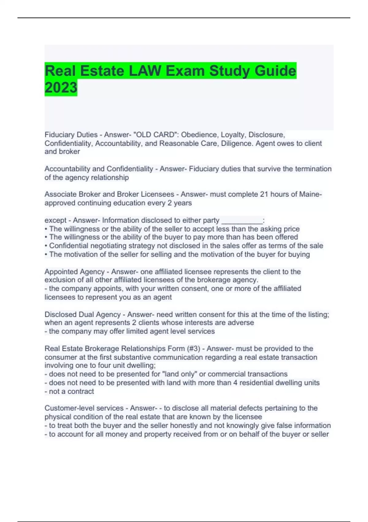 Real Estate LAW Exam Study Guide 2023 Questions and Answers 2 Exam (elaborations) Real Estate Law- Exam #1 ch 1,2,4,5 Questions and Answers 3 Exam (elaborations) Pearson Vue real estate exam Maine questions and answers 4 Exam (elaborations) MAINE STATE EXAM QUESTIONS AND ANSWERS 5 Exam (elaborations) Maine specific- Real Estate Exam prep Questi