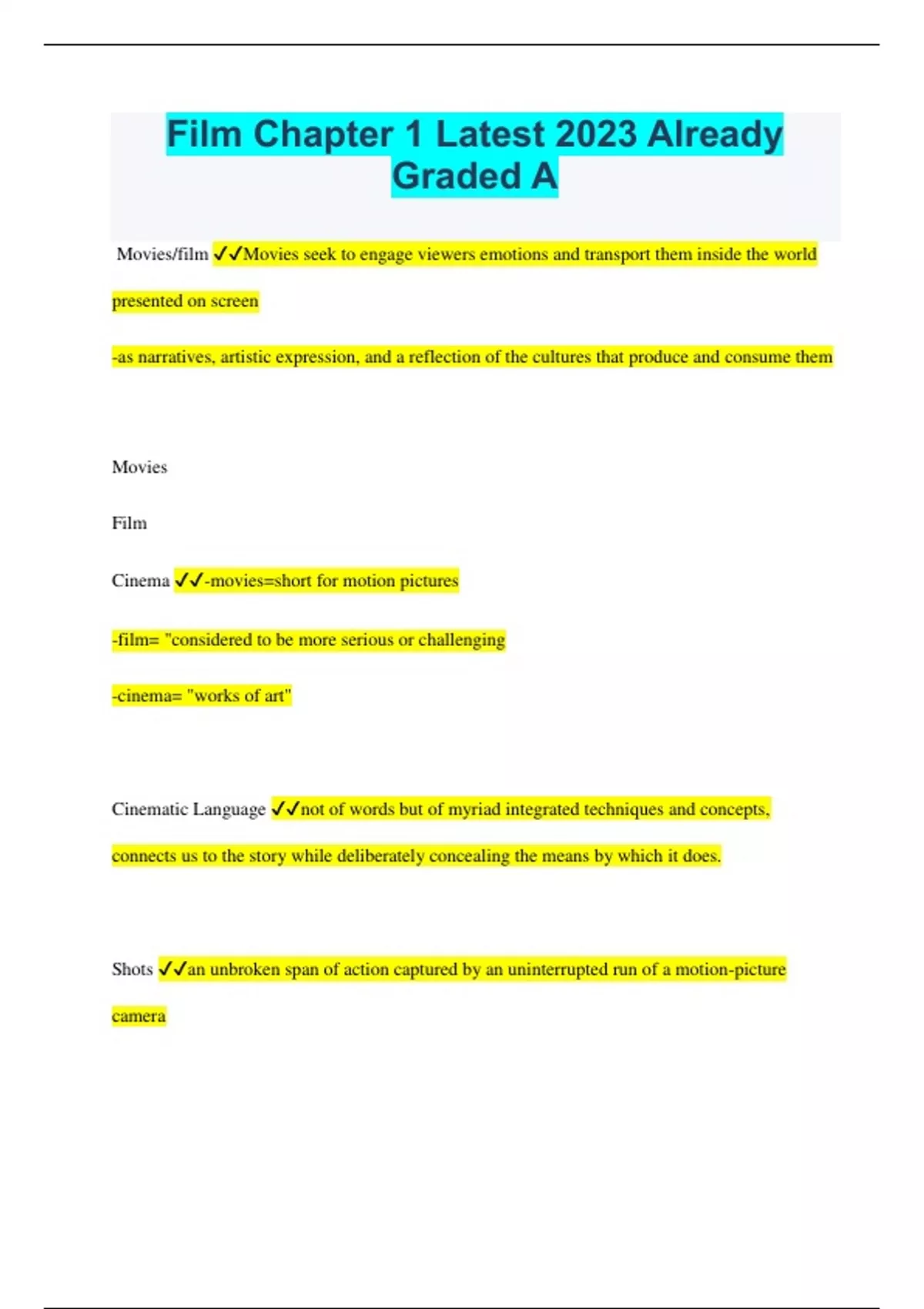 Film Bundled Exams Questions and Answers (All Chapters) with Complete and Certified Solutions