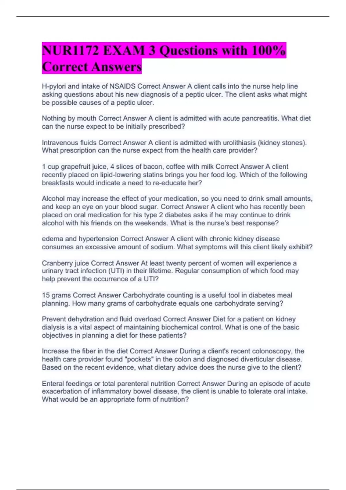 NUR1172 EXAM 3 Questions with 100% Correct Answers NUR1172 EXAM 1 Testbank Chap 2-5 Questions with 100% Correct Answers NUR1172 Nutritional Principles in Nursing- Chapter 4 Practice Test Questions with 100% Correct Answer NUR 1172 GI Intubation and Special Nutrition Modalities Exam Questions with 100% Correct Answers Rasmussen NUR 1172 Nutrition Ex