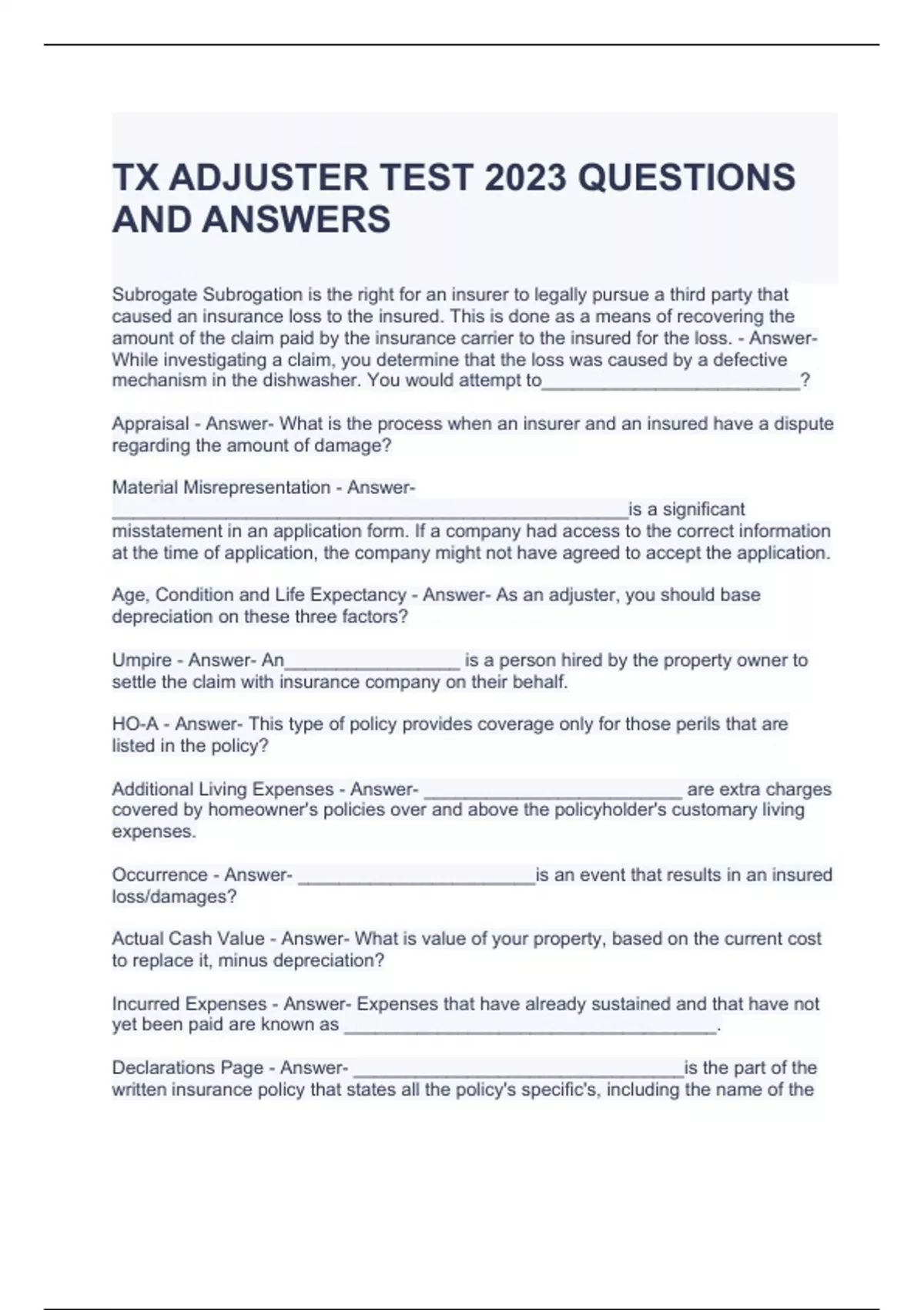 TX ADJUSTER TEST 2023 QUESTIONS AND ANSWERS 2 Exam (elaborations) TEXAS Insurance Adjusting Needed Questions and Answers Graded A 3 Exam (elaborations) Texas Insurance Adjuster Glossary Exam 4 Exam (elaborations) Texas All-Lines Adjuster Self-Study Terms for 360 Training test (possible) 5 Exam (elaborations) Texas All-Lines Adjuster Pre-Licensi