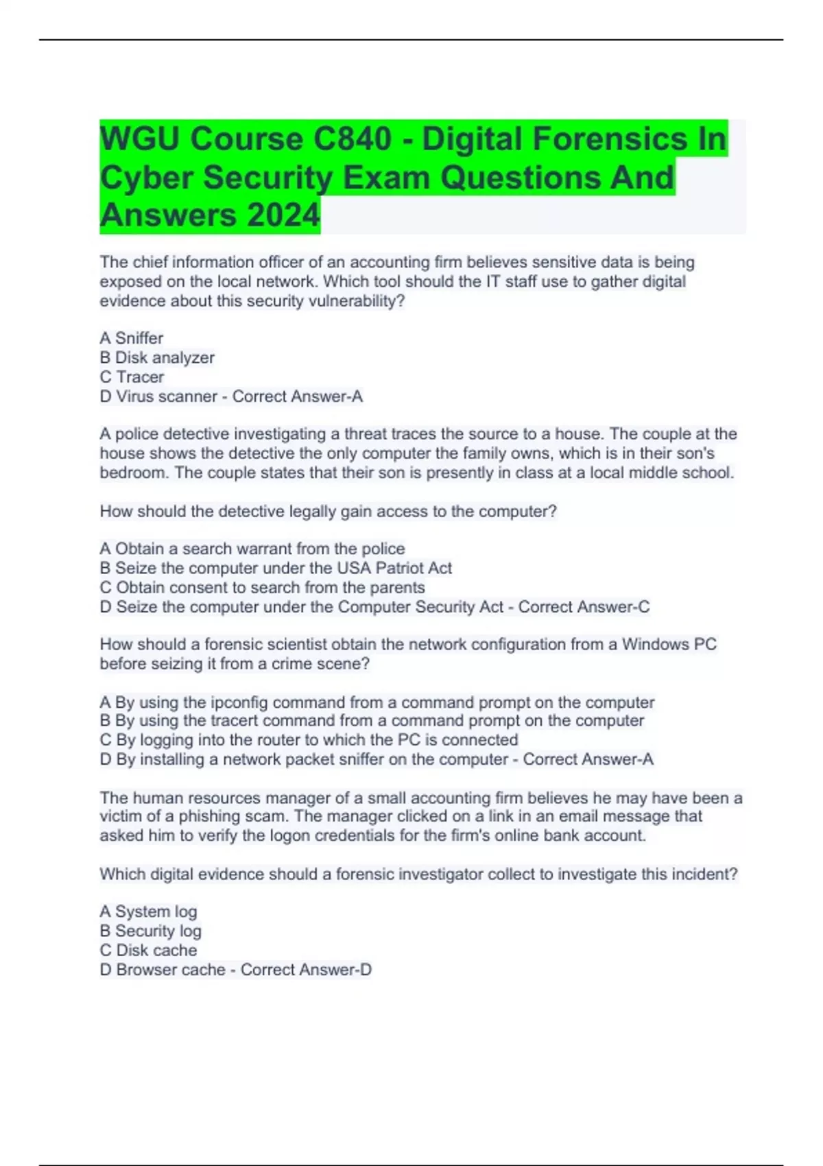 WGU C840 - Digital Forensics In Cyber Security Questions And Answers 2024 WGU C840 Digital Forensics In Cyber Security Questions With 100% Correct Answers 2024 WGU C840 - Digital Forensics Exam With 100% Correct Answers 2023 WGU C840 EXAM QUESTIONS WITH 100% CORRECT ANSWERS 2024