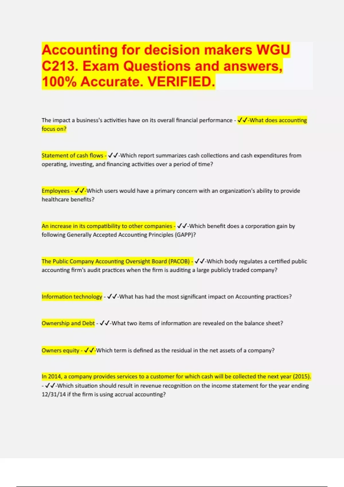 Accounting for decision makers WGU C213. Exam Questions and answers, 100% Accurate. VERIFIED 2024 | 23 Pages