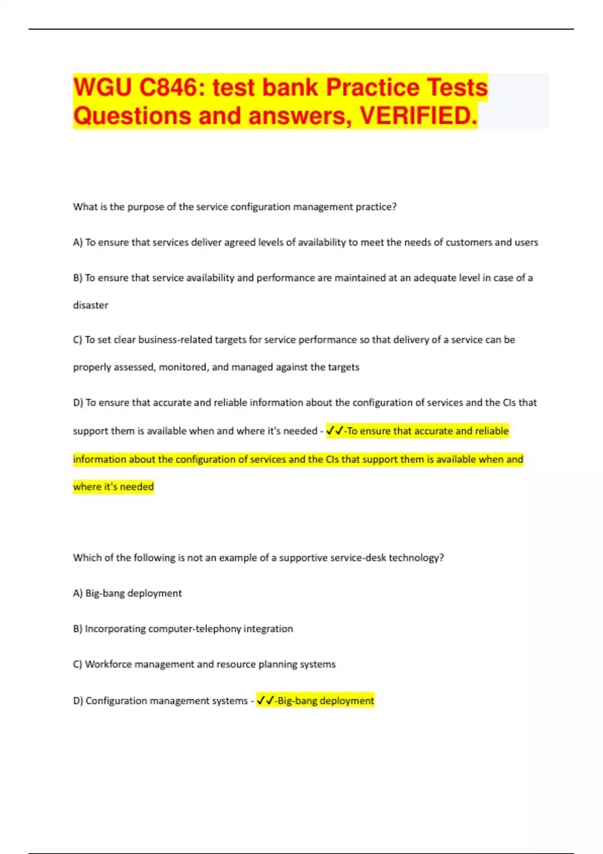 WGU C846 Flash Cards from U-certify, WGU C846 ITIL, Business of IT, Questions and answers, VERIFIED | 86 Pages