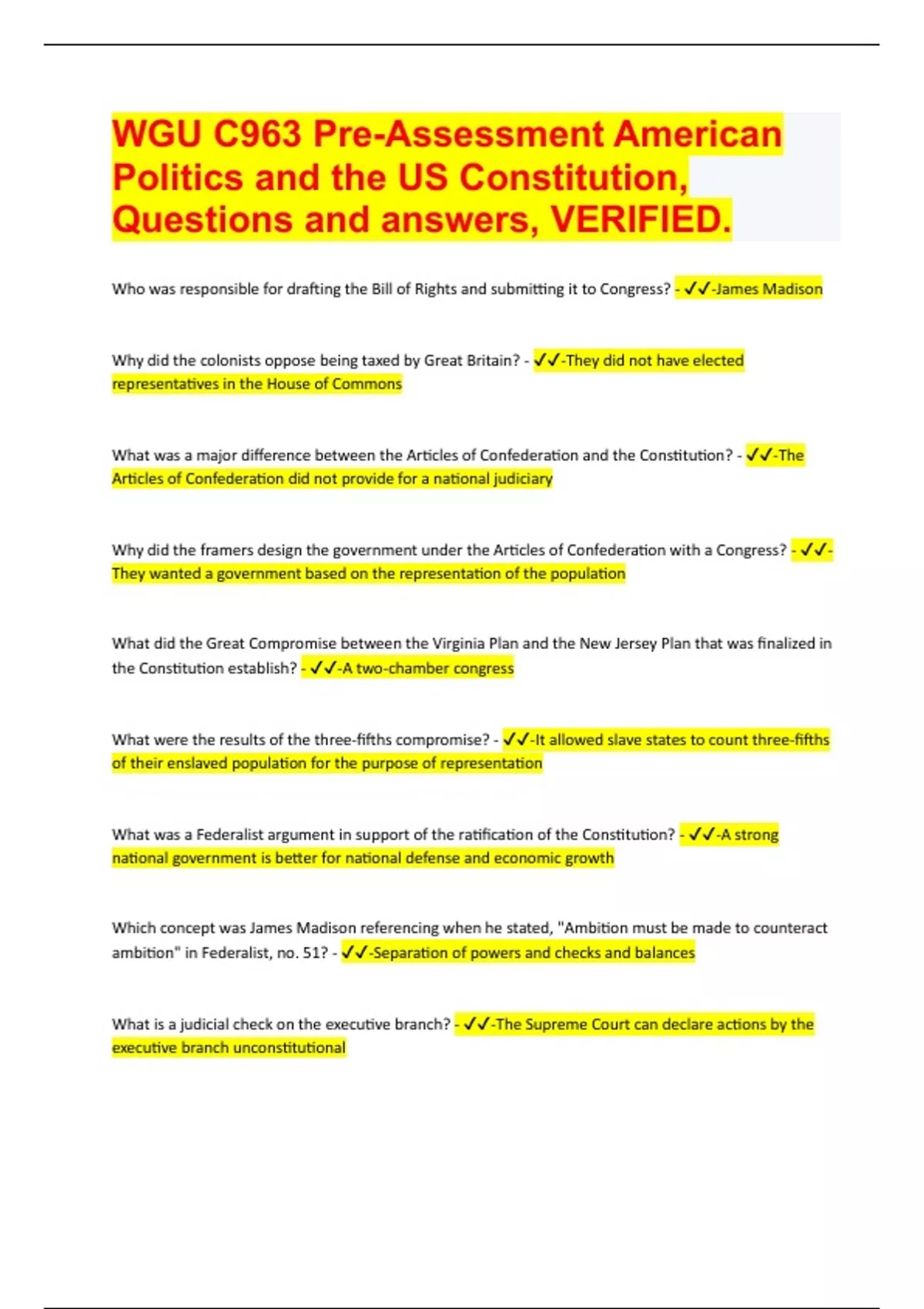 WGU C963 Pre-Assessment American Politics and the US Constitution, Questions and answers, VERIFIED