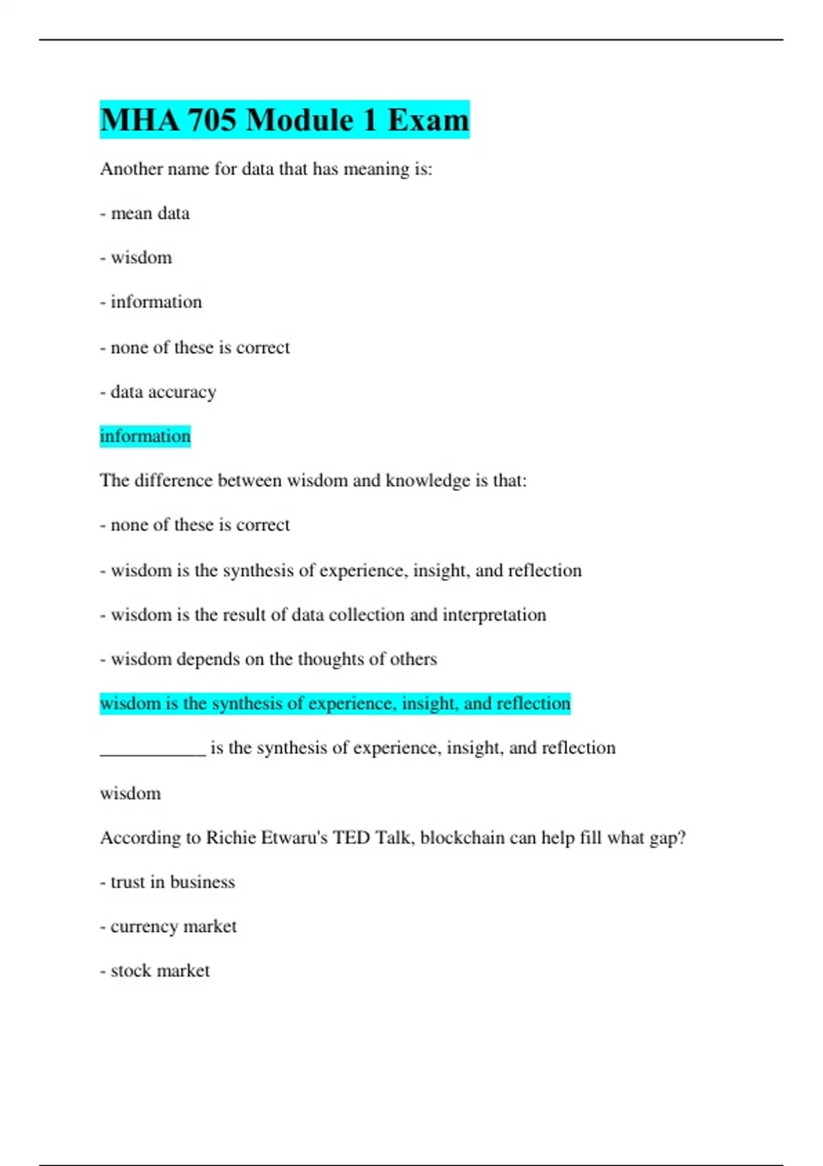 MHA 705 Modules 1-7 Exams|All Bundled Together