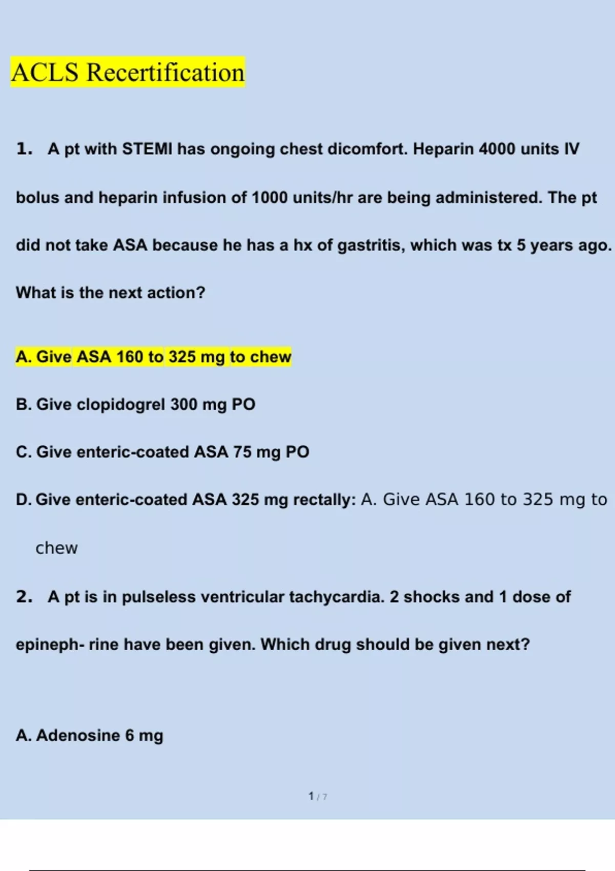 AHA ACLS Recertification (2023/2024) Newest Questions and Answers (Verified Answers)